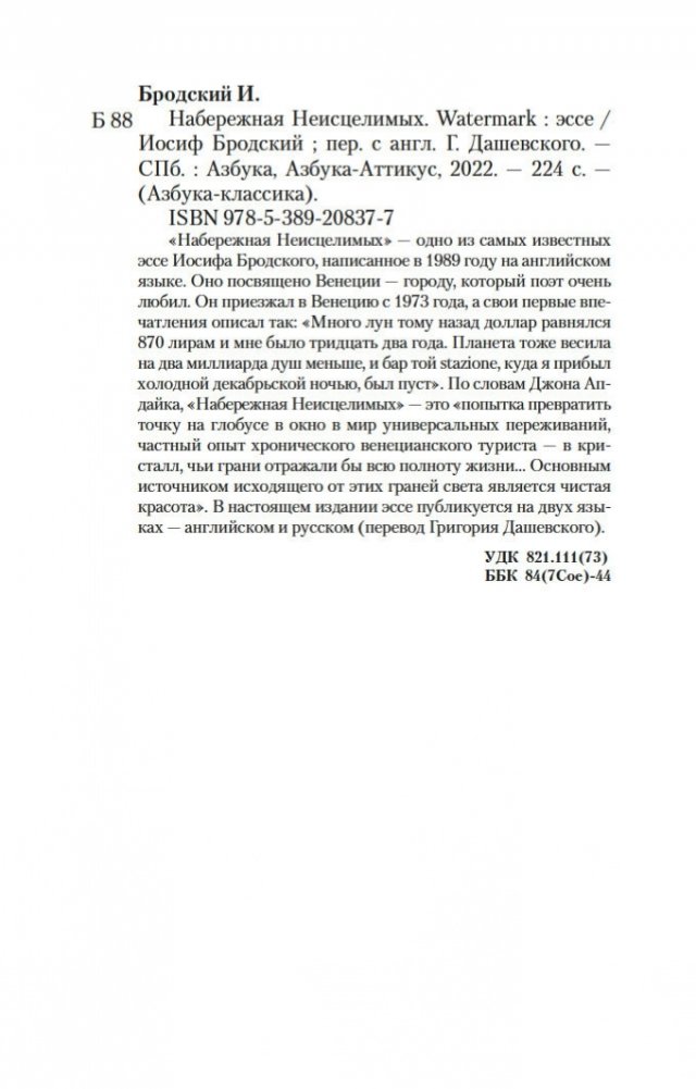 «Набережная Неисцелимых» — одно из самых известных эссе Иосифа Бродского, написанное в 1989 году на английском языке. Это автобиографическое произведение посвящено Венеции, впечатлениям поэта от города, встречам с ним — воображаемым и действительным. По словам Льва Лосева, и по-английски, и по-русски оно «читается как поэтический текст par excellence». На современных картах Венеции набережной Неисцелимых не существует, но в начале XVII века такое название получило место, где располагался госпиталь для больных чумой. Это часть современной набережной Дзаттере; там и сегодня можно увидеть таблички, напоминающие о сотнях тысяч жертв эпидемии: «Дзаттере, бывшая Неисцелимых». Джон Апдайк писал: «Эссе „Набережная Неисцелимых“ — это попытка превратить точку на глобусе в окно в мир универсальных переживаний, частный опыт хронического венецианского туриста — в кристалл, чьи грани отражали бы всю полноту жизни... Основным источником исходящего от этих граней света является чистая красота». В настоящем издании эссе публикуется на двух языках — русском и английском (перевод Григория Дашевского).