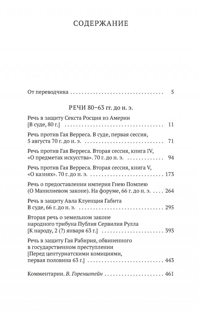 В сборник вошли избранные речи Цицерона 80–63 гг. до н. э., в том числе его самая первая речь в уголовном суде в защиту Cекста Росция, создавшая молодому Цицерону славу гениального оратора, и речи против наместника Сицилии, коррупционера, взяточника и тирана Гая Верреса.