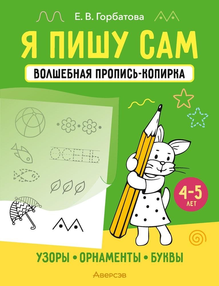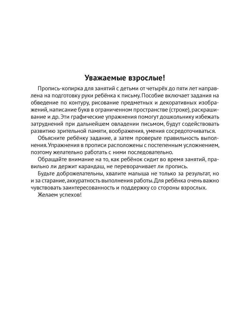Пропись-копирка для занятий с детьми от четырёх до пяти лет направлена на подготовку руки ребёнка к письму. Пособие включает задания на обведение по контуру, рисование предметных и декоративных изображений, написание букв в ограниченном пространстве (строке), раскрашивание и др. Эти графические упражнения помогут дошкольнику избежать затруднений при дальнейшем овладении письмом, будут содействовать развитию зрительной памяти, воображения, умения сосредоточиваться.