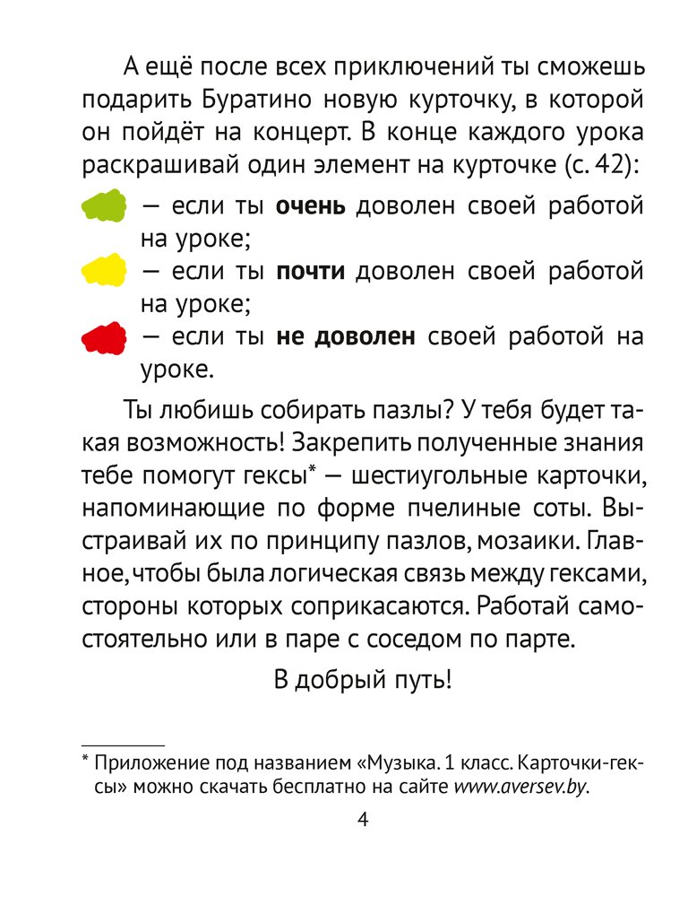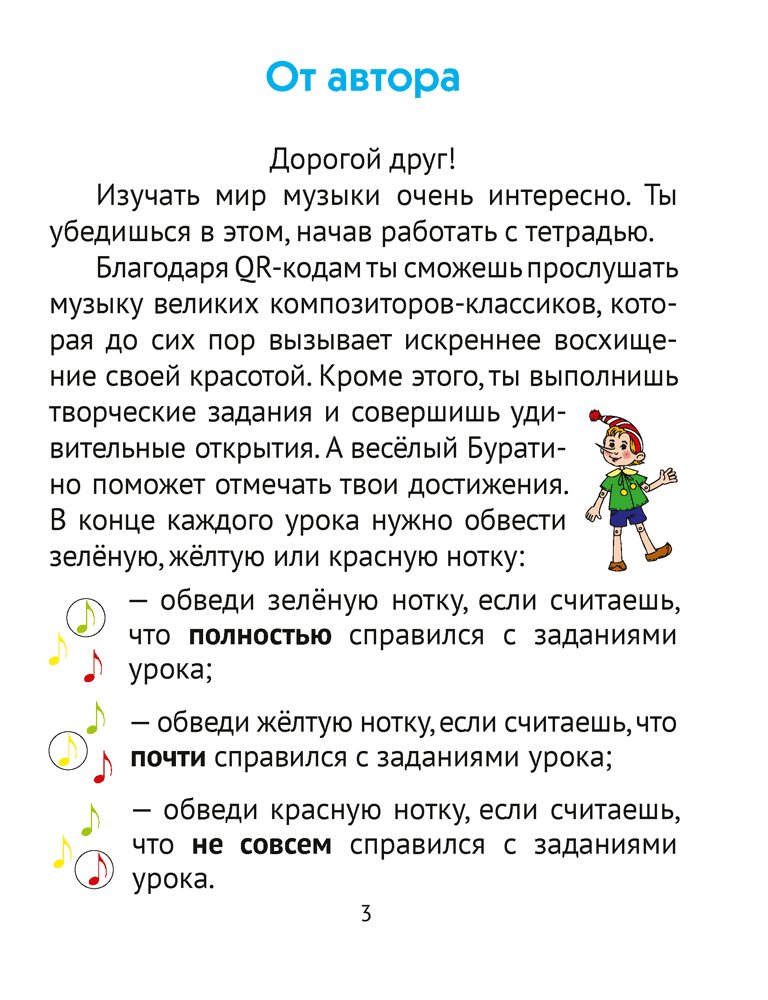 Рабочая тетрадь соответствует учебной программе по музыке и содержит разнообразные задания, направленные на развитие творческих способностей учащихся и формирование интереса к предмету. В пособии размещены QR-коды, с помощью которых первоклассники смогут послушать фрагменты музыкальных произведений и звуки природы, ознакомиться со звучанием музыкальных инструментов. На каждом уроке предусмотрена система самооценки. При закреплении знаний предлагается использовать гексы, доступные для бесплатного скачивания на нашем сайте.