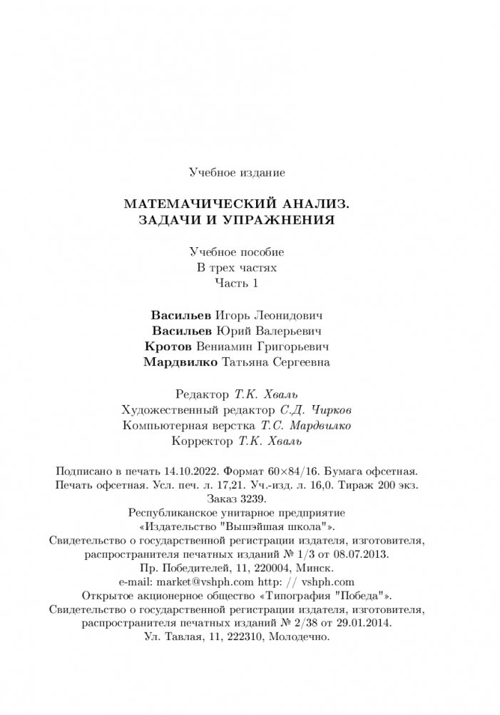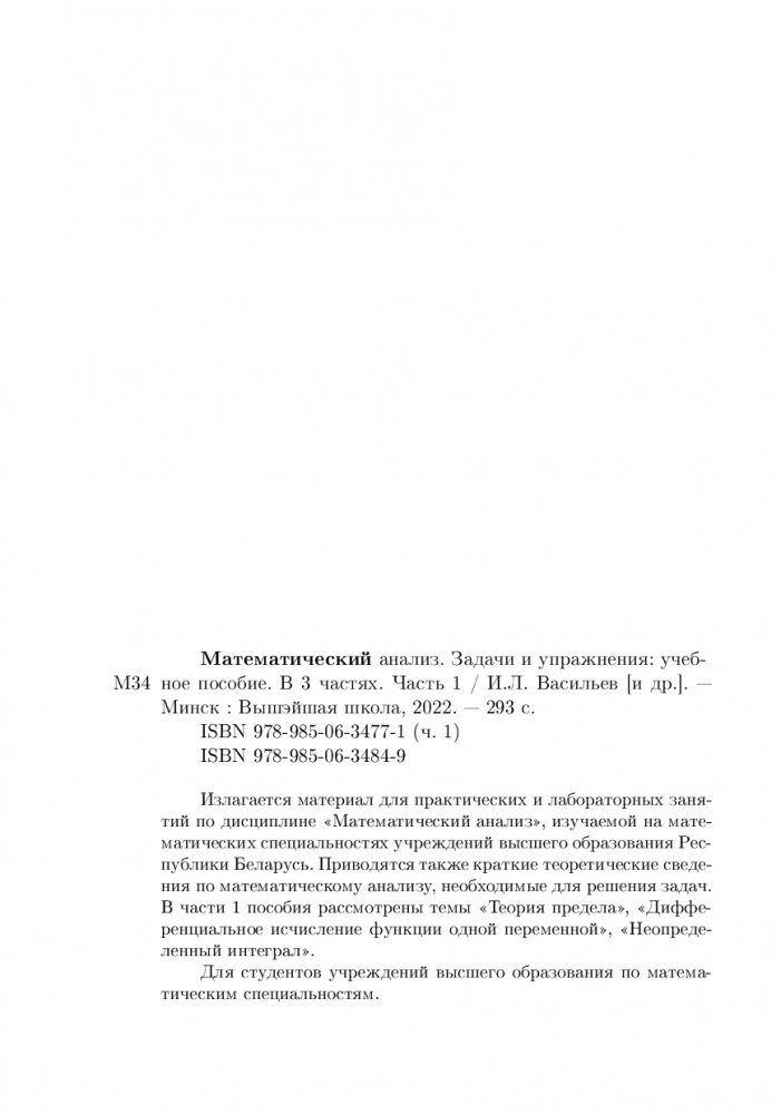 В учебном пособии излагается материал для практических и лабораторных занятий по дисциплине "Математический анализ", изучаемой на математических специальностях учреждений высшего образования Республики Беларусь. Приводятся также краткие теоретические сведения по математическому анализу, необходимые для решения задач. В части 1 пособия рассмотрены темы "Теория предела", "Дифференциальное исчисление функции одной переменной", "Неопределенный интеграл".