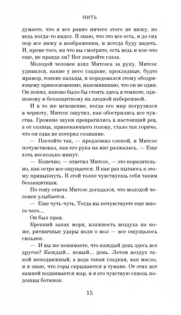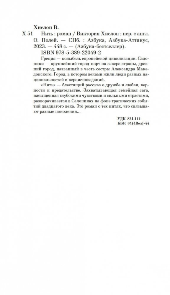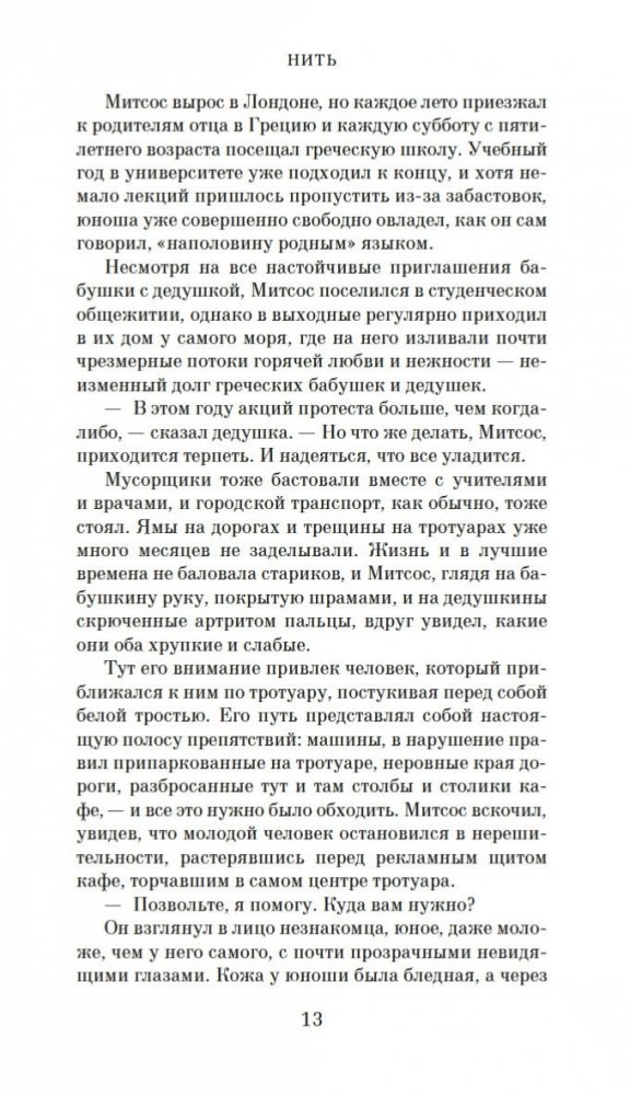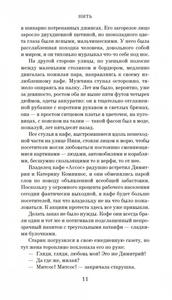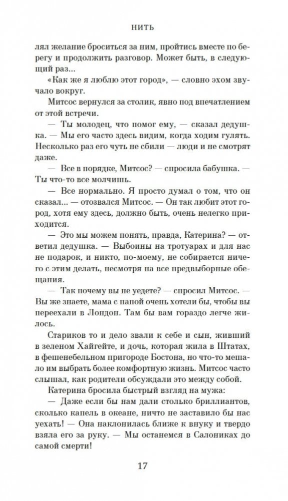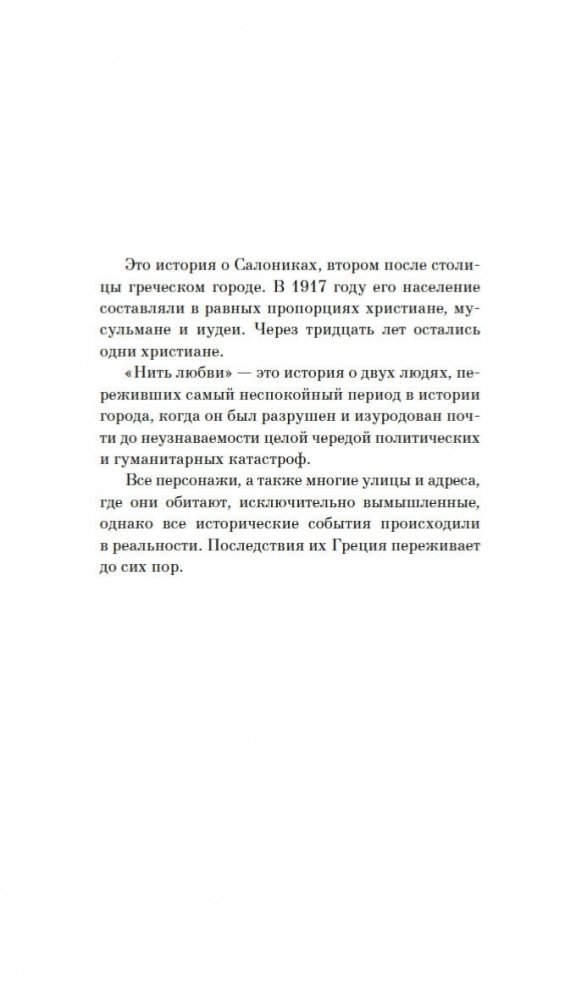 Греция — колыбель европейской цивилизации. Салоники — крупнейший город-порт на севере страны, древний город, названный в честь сестры Александра Македонского. Город, в котором веками жили люди разных национальностей и вероисповеданий. «Нить» — блестящий рассказ о дружбе и любви, верности и предательстве. Захватывающая семейная сага, насыщенная глубокими чувствами и сильными страстями, разворачивается в Салониках на фоне трагических событий двадцатого века. Это роман о тех нитях, что связывают разные поколения…
