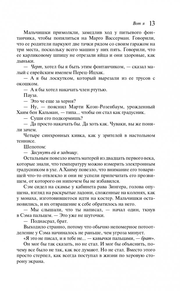 Последний художественный роман Фоера ждали более десяти лет. «Вот я» — масштабное эпическое повествование, книга, явно претендующая на звание большого американского романа. Российский читатель обязательно вспомнит всем известную цитату из «Анны Карениной»: «Каждая семья несчастлива по-своему». Для героев романа «Вот я», Джейкоба и Джулии, полжизни проживших в браке и воспитавших трех сыновей, разлад воспринимается не просто как несчастье — как конец света. Частная трагедия усугубляется трагедией глобальной — сильное землетрясение на Ближнем Востоке ведет к нарастанию военного конфликта. Рвется связь времен и связь между людьми — одиночество ощущается с доселе невиданной остротой, каждый оказывается наедине со своими страхами.