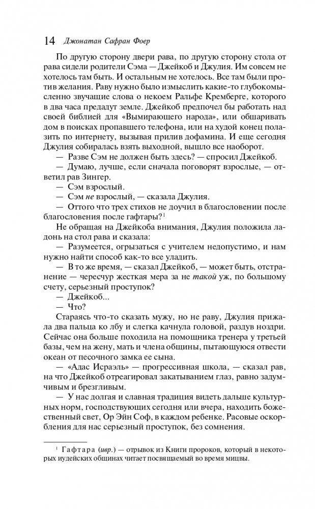 Джонатан Сафран Фоер — автор романов «Полная иллюминация», «Жутко громко и запредельно близко», «Вот я» и нехудожественных произведений «Мясо. Eating Animals» и «Погода — это мы».