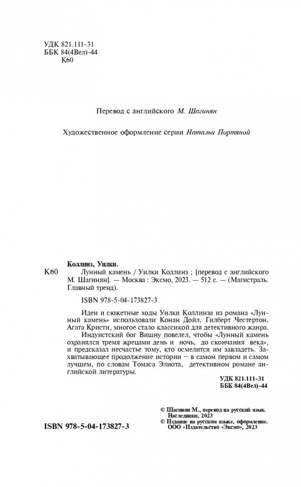 Индуистский бог Вишну повелел, чтобы «Лунный камень охранялся тремя жрецами день и ночь, до скончания века» и предсказал несчастье тому, кто осмелится им завладеть. Захватывающее продолжение истории — в самом первом и самом лучшем, по словам Томаса Элиота, детективном романе английской литературы.