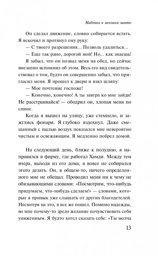 «Мадонна в меховом манто» — пронзительная «ремарковская» история любви Раифа-эфенди — отпрыска богатого османского рода, волею судьбы превратившегося в мелкого служащего, и немецкой художницы Марии. Действие романа разворачивается в 1920-е годы прошлого века в Берлине и Анкаре, а его атмосфера близка к предвоенным романам Эриха Марии Ремарка.