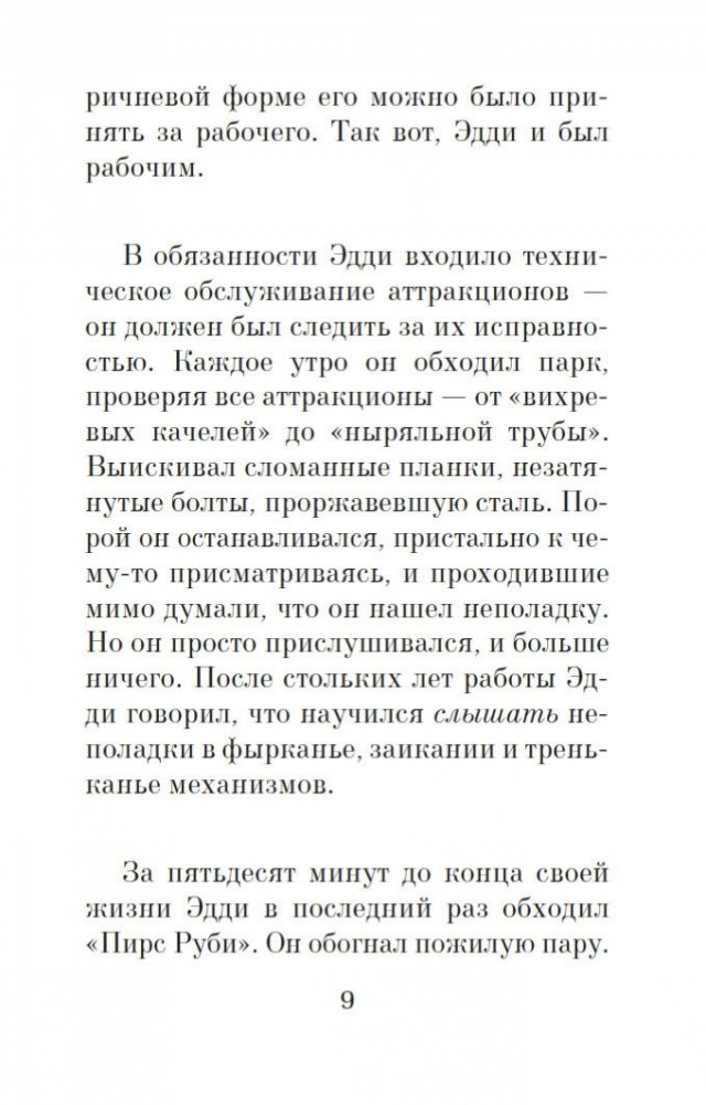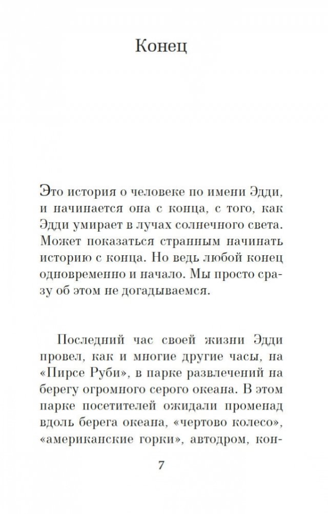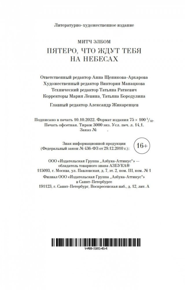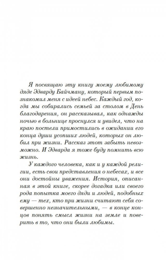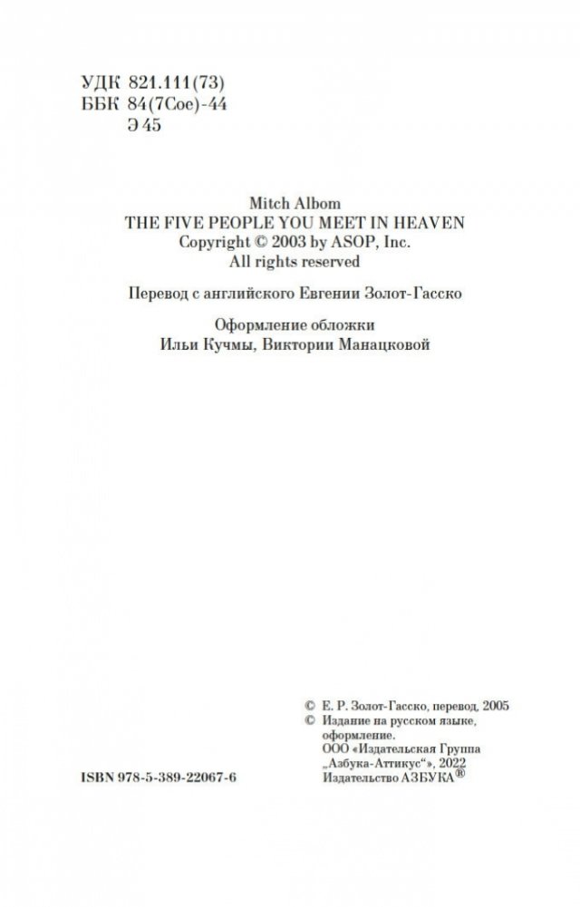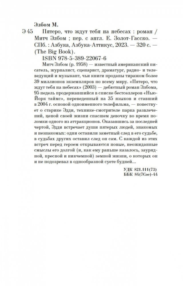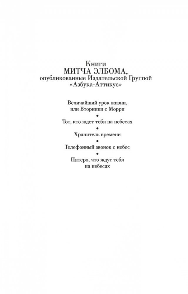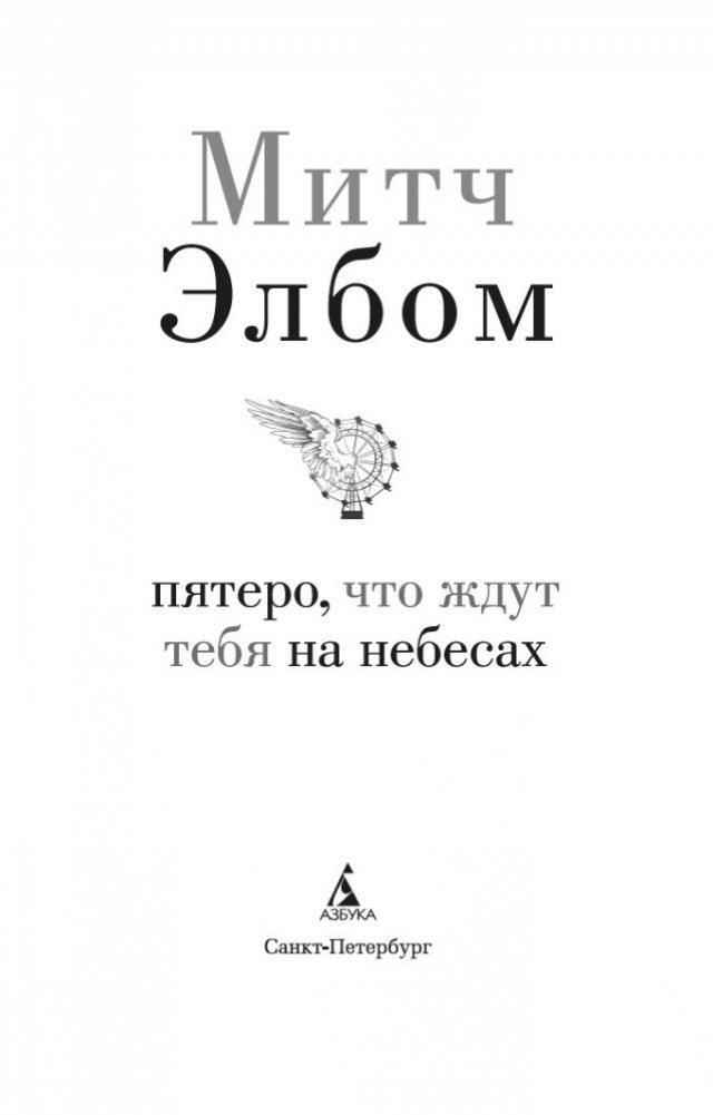 Митч Элбом (р. 1958) — известный американский писатель, журналист, сценарист, драматург, радио- и телеведущий и музыкант, чьи книги проданы тиражом более 39 миллионов экземпляров по всему миру. «Пятеро, что ждут тебя на небесах» (2003) – дебютный роман Элбома, 95 недель продержавшийся в списке бестселлеров «Нью-Йорк таймс», переведенный на 35 языков и ставший в 2004 г. основой одноименного телефильма, — повествует о старике Эдди, технике-смотрителе парка развлечений, ценой своей жизни спасшем девочку во время поломки одного из аттракционов. Оказавшись за последней чертой, Эдди встречает души пятерых людей, знакомых и незнакомых: одни оставили заметный след в его судьбе, в судьбах других оставил след он сам. С каждой из этих встреч перед героем открываются новые, неожиданные смыслы его долгой (и, как ему раньше казалось, заурядной, пресной и никчемной) земной жизни, о которых он и не подозревал в однообразной суете будней…