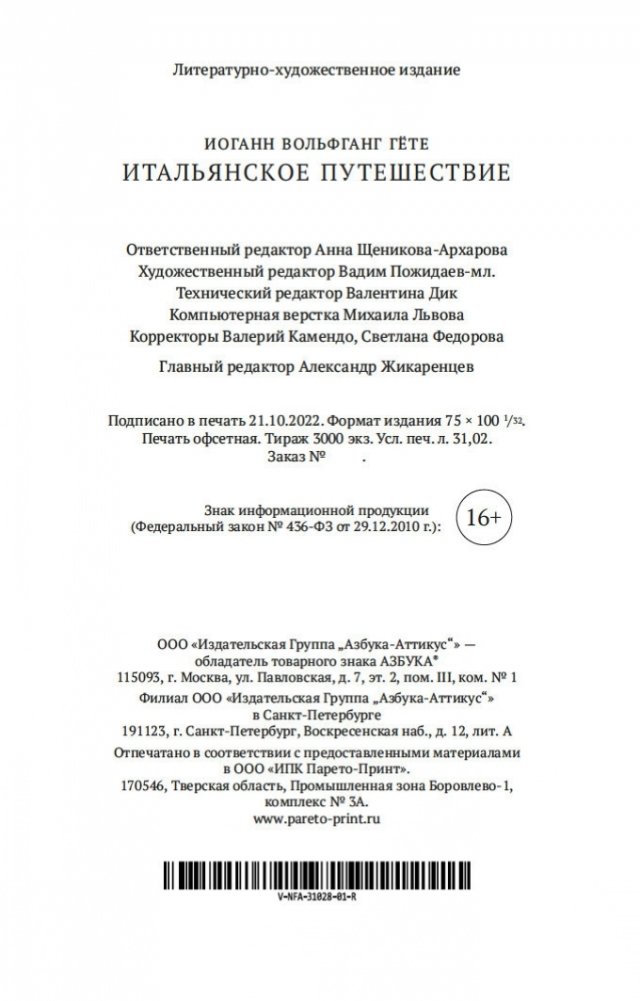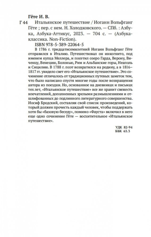 В 1786 г. тридцатисемилетний Иоганн Вольфганг Гёте отправился в Италию. Путешествовал он инкогнито, под именем купца Меллера, и посетил озеро Гарда, Верону, Виченцу, Венецию, Болонью, Рим и Альбанские горы, Неаполь и Сицилию. В 1788 г. поэт возвратился на родину, а в 1816–1817 гг. увидело свет его «Итальянское путешествие». Это сочинение отличалось от традиционных путевых заметок тем, что было написано спустя многие годы после возвращения автора из поездки. Но, основанное на дневниках и письмах тех лет, «Итальянское путешествие» все же хранит свежесть впечатлений, дополненных зрелыми размышлениями и отшлифованных до подлинного литературного совершенства. Иосиф Бродский, составляя свой список произведений, который должен прочесть каждый человек, чтобы поддержать хотя бы «базовую беседу», помимо «Фауста» включил в него еще одно сочинение Гёте — восхитительное «Итальянское путешествие».