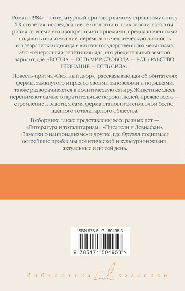 Роман "1984" – литературный приговор самому страшному опыту ХХ столетия, исследование технологии и психологии тоталитаризма со всеми его изощренными приемами, предназначенными подавить инакомыслие, перемолоть человеческую личность и превратить индивида в винтик государственного механизма. Это "генеральная репетиция" ада, его убедительный земной вариант, где "ВОЙНА ЕСТЬ МИР. СВОБОДА ЕСТЬ РАБСТВО. НЕЗНАНИЕ ЕСТЬ СИЛА".