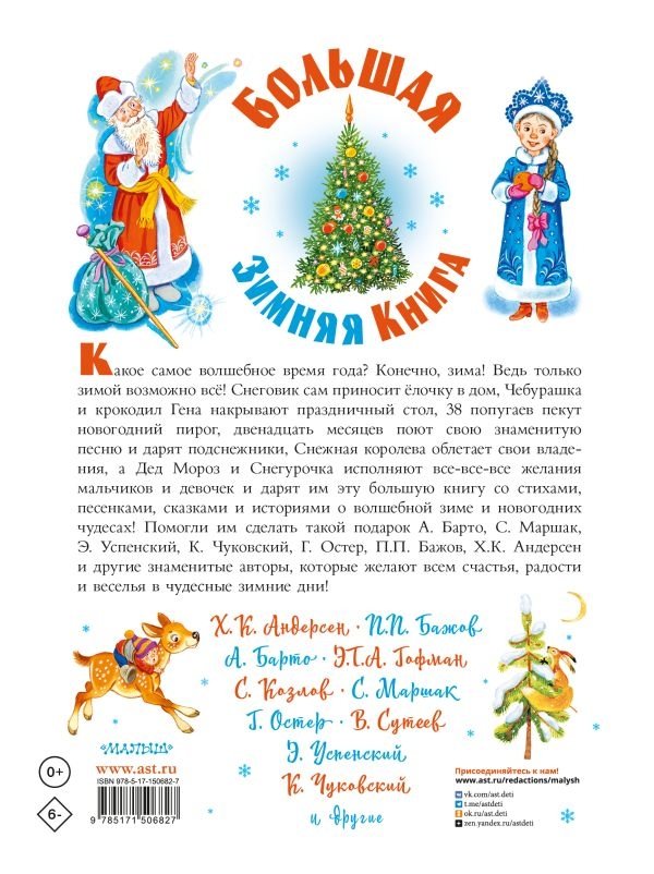 В сборник «Большая зимняя книга» вошли самые знаменитые стихи, сказки и истории о волшебном времени года — зиме! Только зимой случаются чудеса и можно загадывать самые сокровенные желания. В эту большую, цветную, подарочную книгу вошли стихотворения и песенки А. Барто, В. Берестова, С. Маршака, Анастасии Орловой и других писателей, народные и авторские сказки В. Ф. Одоевского, В. Сутеева, Э. Успенского, Г. Остера, Х. К. Андерсена, Э. Т. А. Гофмана и других, истории В. Драгунского, И. Зартайской и ещё многих‑многих других великолепных авторов, которые верят в чудо и дарят вам частичку волшебства.