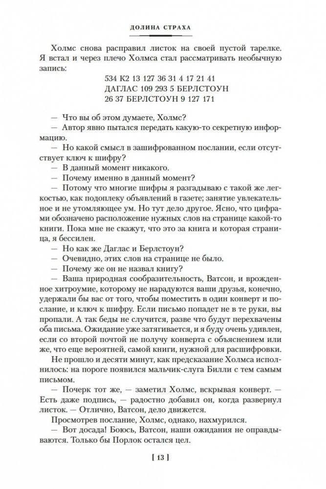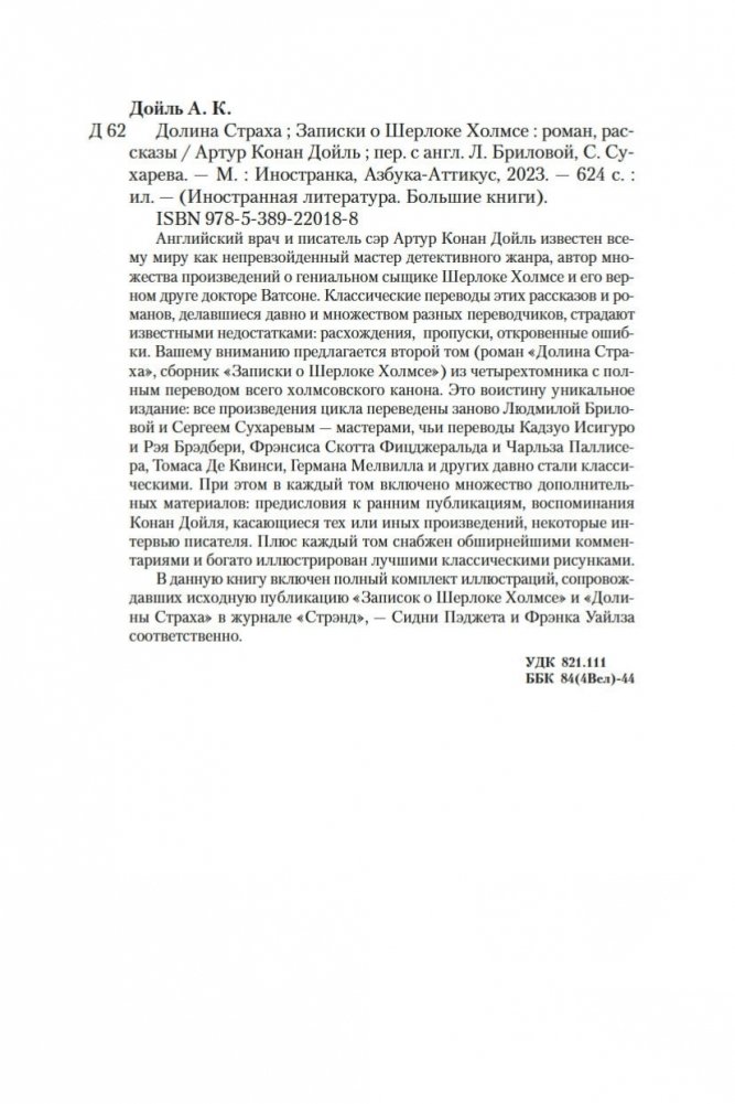 Английский врач и писатель сэр Артур Конан Дойль известен всему миру как непревзойденный мастер детективного жанра, автор множества произведений о гениальном сыщике Шерлоке Холмсе и его верном друге докторе Ватсоне. Классические переводы этих рассказов и романов, делавшиеся давно и множеством разных переводчиков, страдают известными недостатками: расхождения, пропуски, откровенные ошибки. Вашему вниманию предлагается второй том (роман «Долина Страха», сборник «Записки о Шерлоке Холмсе») из четырехтомника с полным переводом всего холмсовского канона. Это воистину уникальное издание: все произведения цикла переведены заново Людмилой Бриловой и Сергеем Сухаревым — мастерами, чьи переводы Кадзуо Исигуро и Рэя Брэдбери, Фрэнсиса Скотта Фицджеральда и Чарльза Паллисера, Томаса Де Квинси, Германа Мелвилла и других давно стали классическими. При этом в каждый том включено множество дополнительных материалов: предисловия к ранним публикациям, воспоминания Конан Дойля, касающиеся тех или иных произведений, некоторые интервью писателя. Плюс каждый том снабжен обширнейшими комментариями и богато иллюстрирован лучшими классическими рисунками. В данную книгу включен полный комплект иллюстраций, сопровождавших исходную публикацию «Записок о Шерлоке Холмсе» и «Долины Страха» в журнале «Стрэнд», — Сидни Пэджета и Фрэнка Уайлза соответственно.
