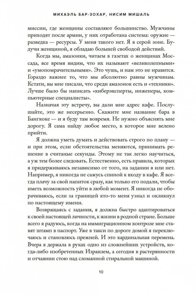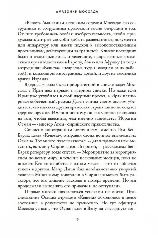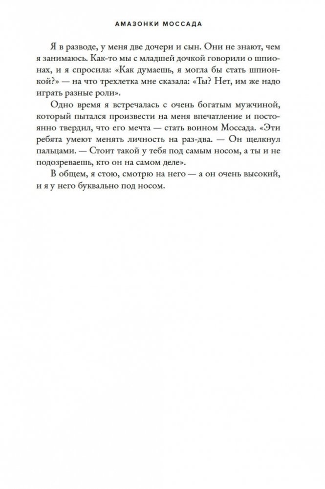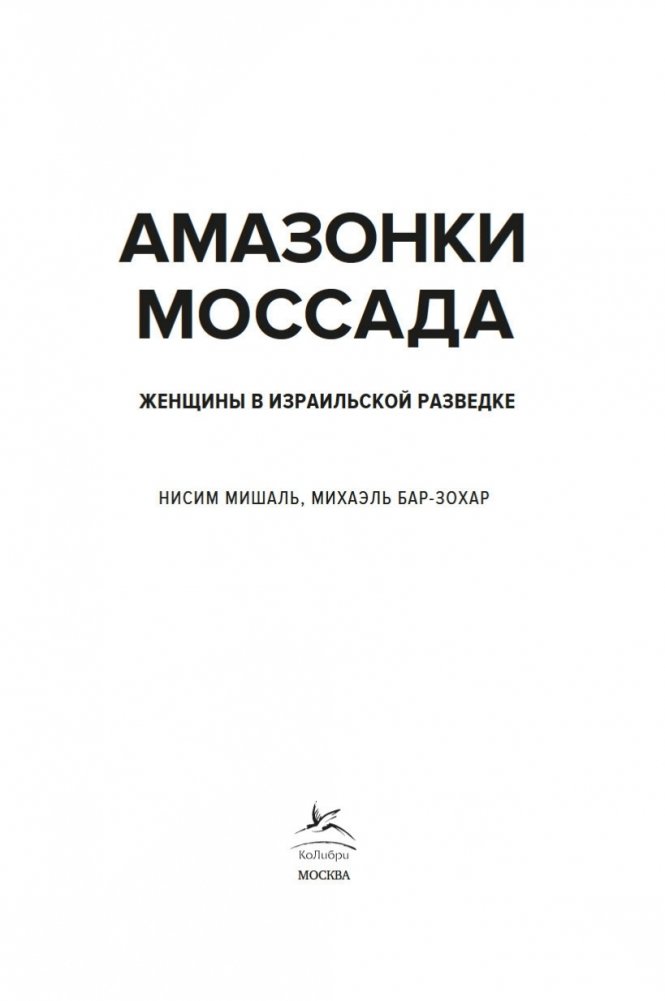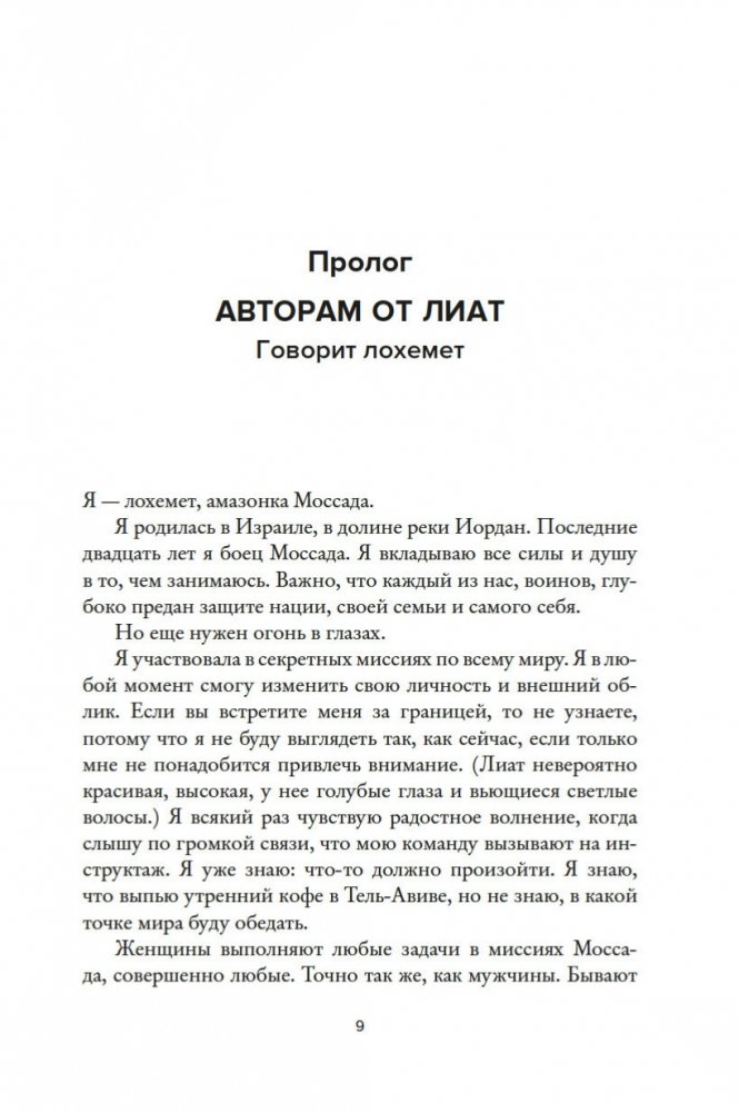 «Огромное количество книг про Моссад рисует обманчивую картину: тайная армия храбрых, сильных и умных мужчин наподобие Джеймса Бонда и других мастеров шпионажа из фильмов, сериалов и романов. Пришло время заменить эту выдуманную картину реальной, где плечом к плечу с мужчинами работают женщины. Невозможно описать всех женщин, служивших в этой секретной армии, — их сотни. Не получится даже перечислить их имена, не говоря уже о том, чтобы изложить все истории полностью: многое из того, чем амазонки Моссада занимались и занимаются, останется засекреченным еще долгие годы. И тем не менее женщины, чьи истории мы решили здесь рассказать, ярко представляют это тайное сообщество защитниц своей родины, ни в чем не уступающих мужчинам, — сообщество, которое до сих пор, намеренно или же случайно, часто оставляют без внимания». (Михаэль Бар-Зохар, Нисим Мишаль)