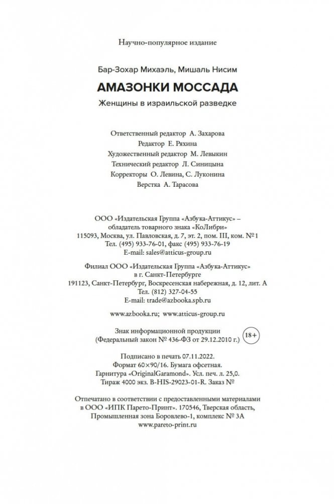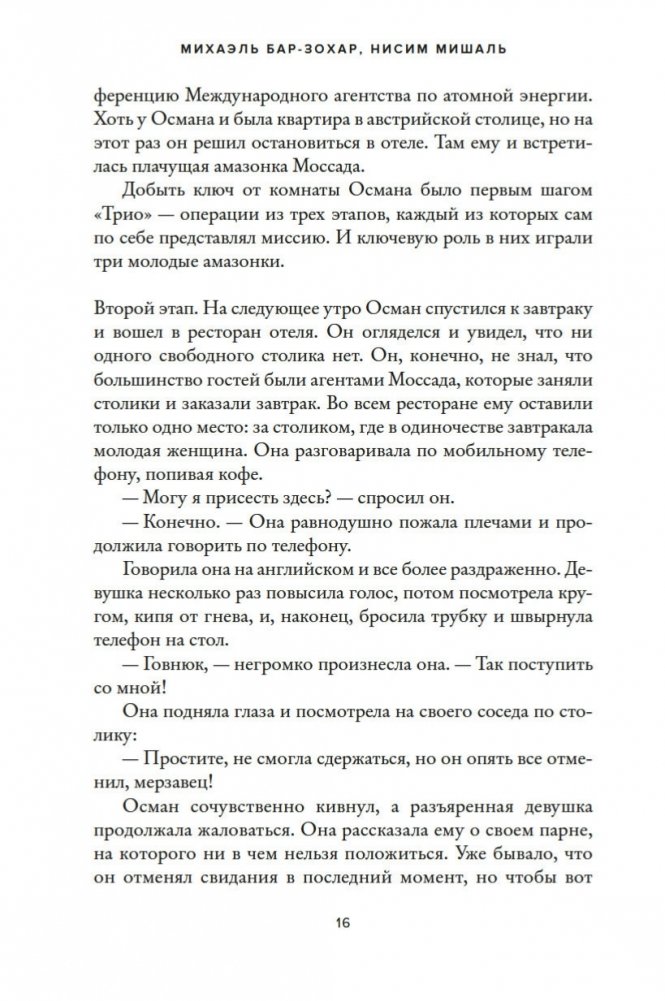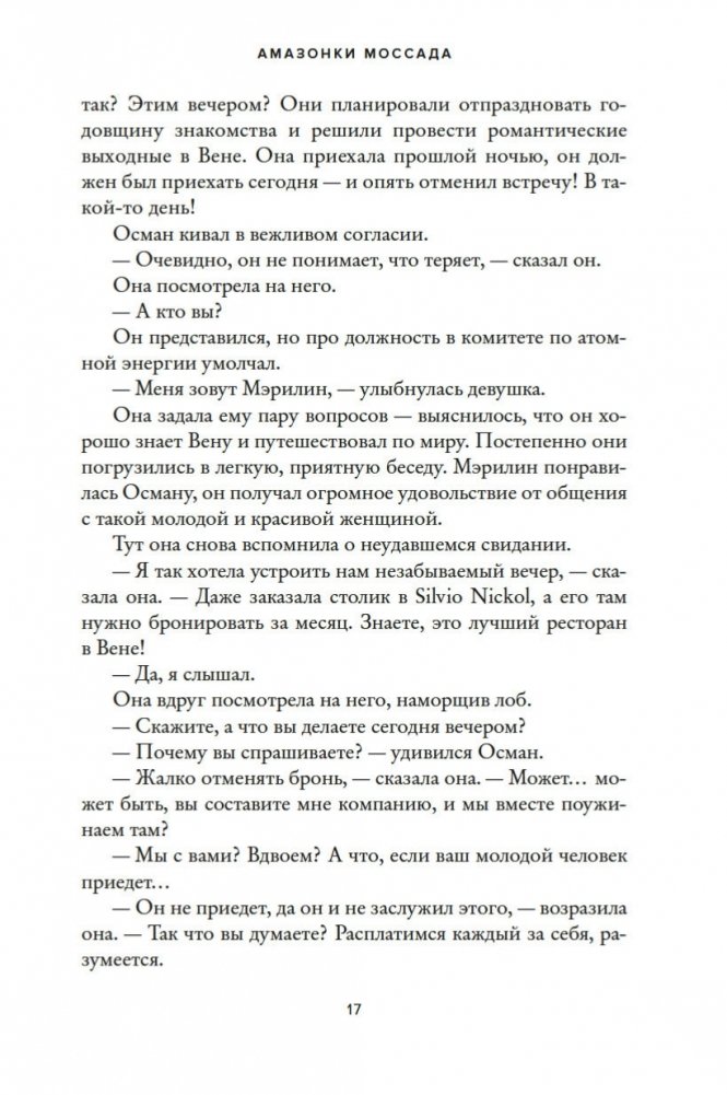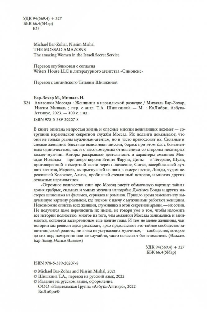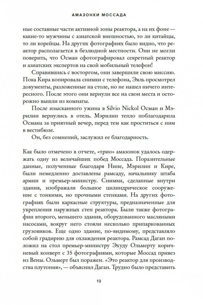 «Огромное количество книг про Моссад рисует обманчивую картину: тайная армия храбрых, сильных и умных мужчин наподобие Джеймса Бонда и других мастеров шпионажа из фильмов, сериалов и романов. Пришло время заменить эту выдуманную картину реальной, где плечом к плечу с мужчинами работают женщины. Невозможно описать всех женщин, служивших в этой секретной армии, — их сотни. Не получится даже перечислить их имена, не говоря уже о том, чтобы изложить все истории полностью: многое из того, чем амазонки Моссада занимались и занимаются, останется засекреченным еще долгие годы. И тем не менее женщины, чьи истории мы решили здесь рассказать, ярко представляют это тайное сообщество защитниц своей родины, ни в чем не уступающих мужчинам, — сообщество, которое до сих пор, намеренно или же случайно, часто оставляют без внимания». (Михаэль Бар-Зохар, Нисим Мишаль)