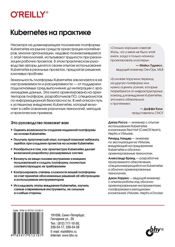 Книга посвящена практическому применению платформы Kubernetes. Подробно рассматривается архитектура Kubernetes и ее составные компоненты. Описаны модели развертывания инфраструктуры, ее топология, принципы автоматизации процессов, среда выполнения контейнеров, хранилища данных и сетевое взаимодействие между элементами системы. Рассматриваются создание и маршрутизация сервисов, управление конфиденциальными данными, допусками, мультитенантность, уровни изоляции и абстрагирование. Приведены наглядные примеры развертывания Kubernetes и оркестрации контейнеров для решения различных практических задач.