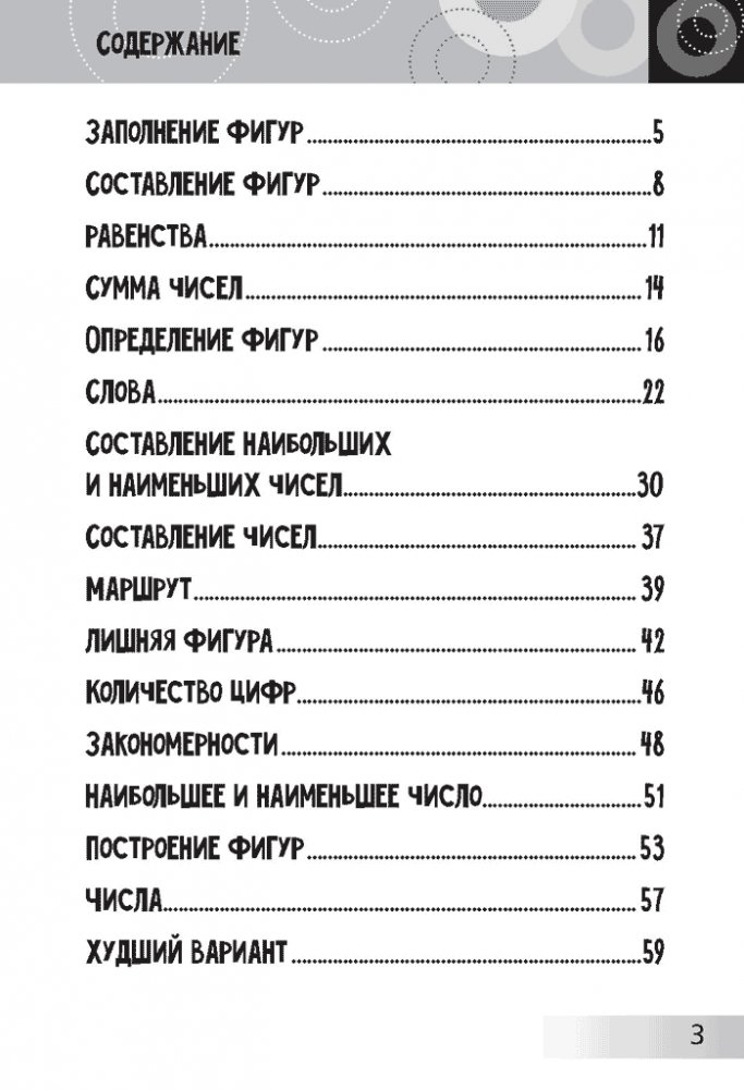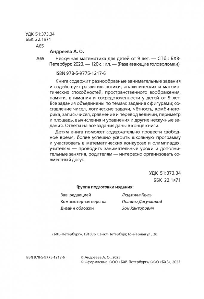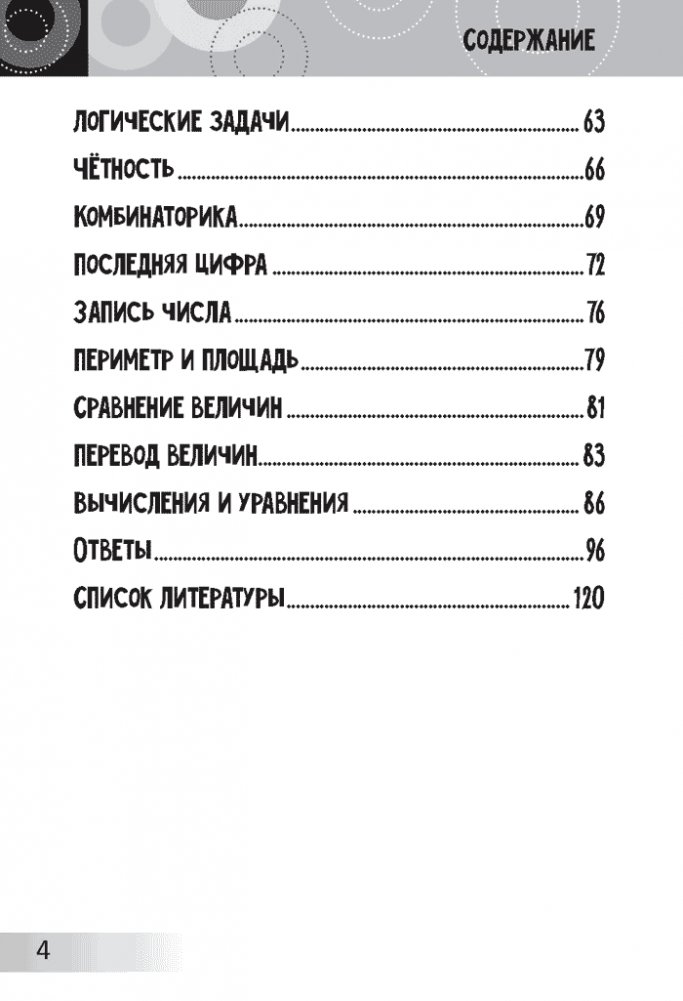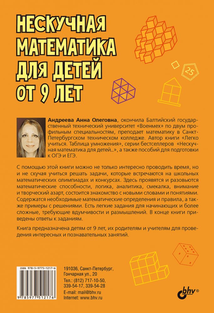 Книга содержит разнообразные занимательные задания и способствует развитию логики, аналитических и математических способностей, пространственного воображения, памяти, внимания и сосредоточенности у детей от 9 лет. Все задания объединены по темам: задания с фигурами; составление чисел, логические задачи, четность, комбинаторика, запись чисел, сравнение и перевод величин, периметр и площадь, вычисления и уравнения и другие нескучные задания. Ответы на все задания даны в конце книги.