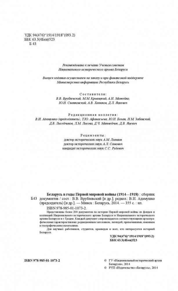 Представлены более 200 документов по истории Первой мировой войны из фондов и коллекций Национального исторического архива Беларуси и Национального исторического архива Беларуси в г. Гродно. Каждый документ сопровождается соответствующими археографическими характеристиками: редакционным заголовком, легендой, примечаниями, именным и географическим указателями.