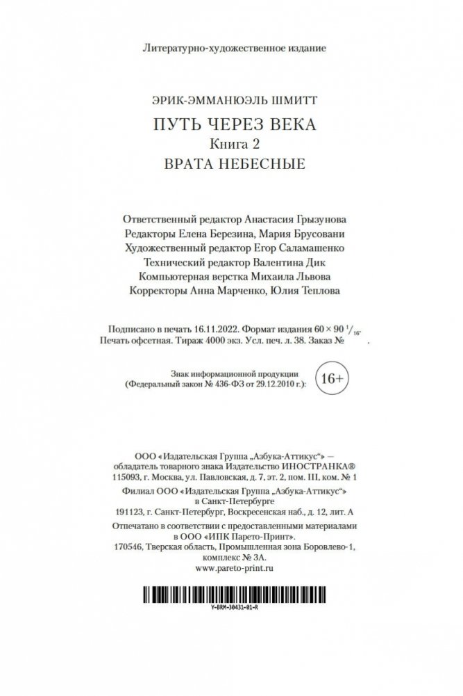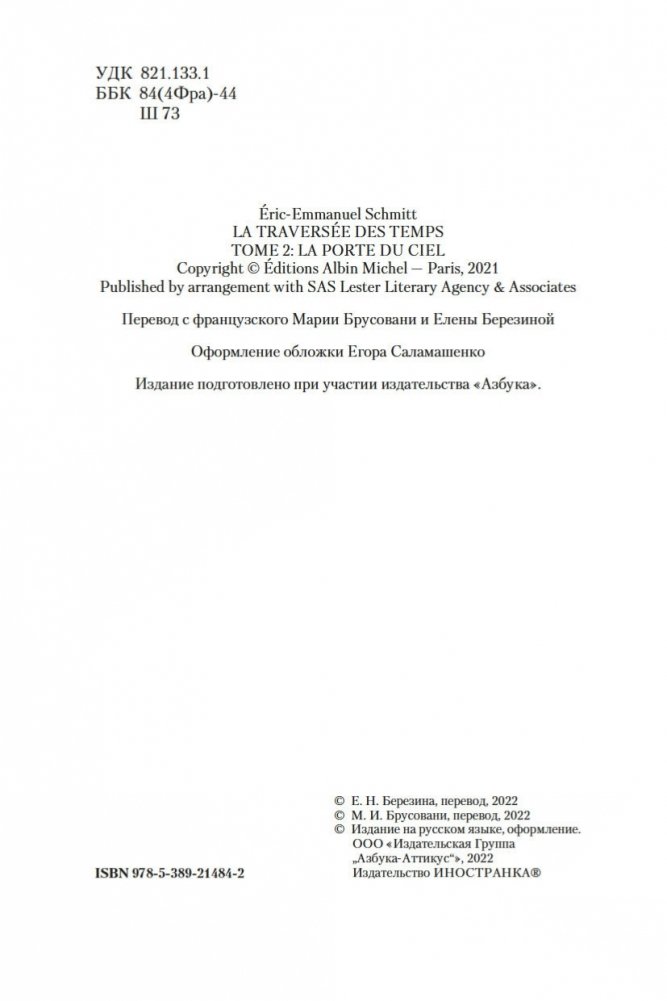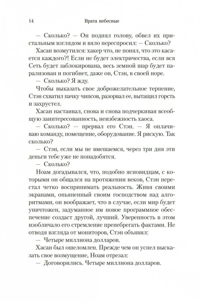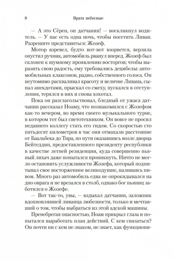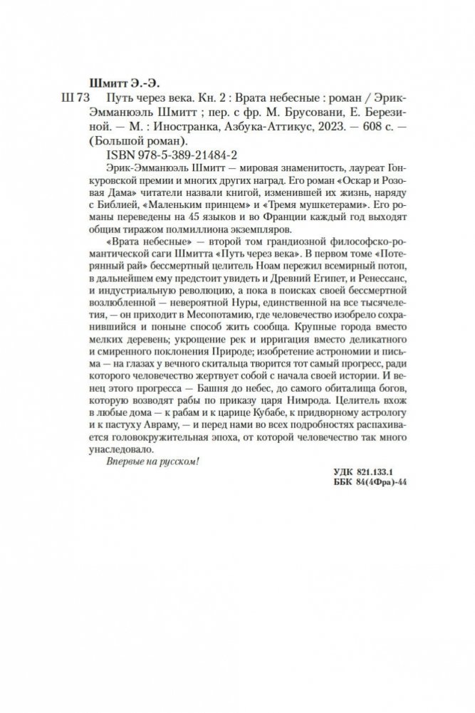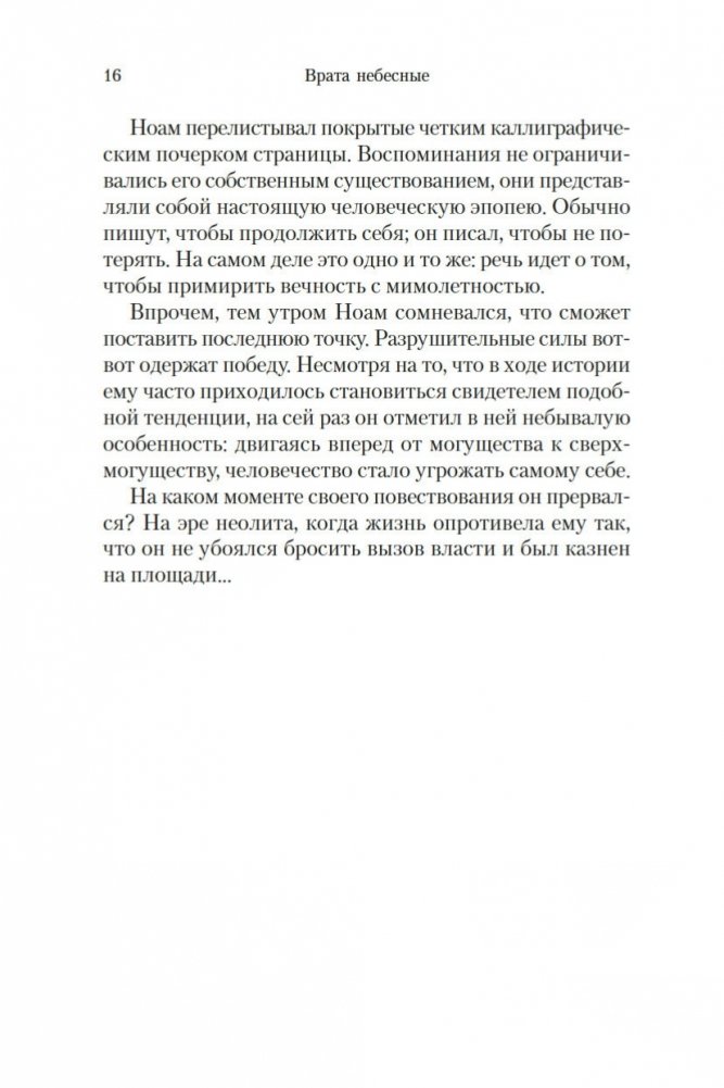 Эрик-Эмманюэль Шмитт — мировая знаменитость, лауреат Гонкуровской премии и многих других наград. Его роман «Оскар и Розовая Дама» читатели назвали книгой, изменившей их жизнь, наряду с Библией, «Маленьким принцем» и «Тремя мушкетерами». Его романы переведены на 45 языков и во Франции каждый год выходят общим тиражом полмиллиона экземпляров. «Врата небесные» — второй том грандиозной философско-романтической саги Шмитта «Путь через века». В первом томе «Потерянный рай» бессмертный целитель Ноам пережил всемирный потоп, в дальнейшем ему предстоит увидеть и Древний Египет, и Ренессанс, и индустриальную революцию, а пока в поисках своей бессмертной возлюбленной — невероятной Нуры, единственной на все тысячелетия, — он приходит в Месопотамию, где человечество изобрело сохранившийся и поныне способ жить сообща. Крупные города вместо мелких деревень; укрощение рек и ирригация вместо деликатного и смиренного поклонения Природе; изобретение астрономии и письма — на глазах у вечного скитальца творится тот самый прогресс, ради которого человечество жертвует собой с начала своей истории. И венец этого прогресса — Башня до небес, до самого обиталища богов, которую возводят рабы по приказу царя Нимрода. Целитель вхож в любые дома — к рабам и к царице Кубабе, к придворному астрологу и к пастуху Авраму, — и перед нами во всех подробностях распахивается головокружительная эпоха, от которой человечество так много унаследовало. Впервые на русском!