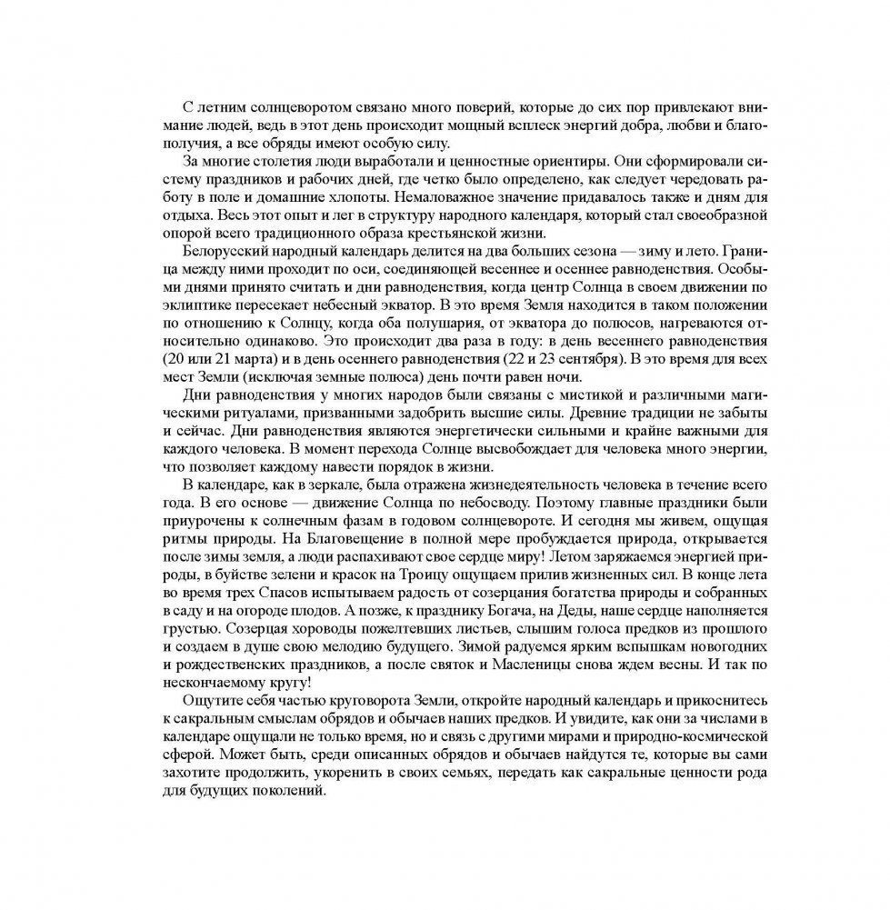 В книге рассматриваются наиболее значимые народные праздники годового цикла, в основу которого положен солнцеворот. Целостный календарный цикл начинается в декабре, когда солнце «поворачивается на лето», предвещая скорое пробуждение матери-земли от зимнего сна, и заканчивается осенью с завершением уборки урожая. Описываются зимние (Коляды, Василье), весенние (Масленица, Сороки, Юрьев день), летние (Купалье, Спасовка) и осенние (Дожинки, Деды, Покров) праздники.