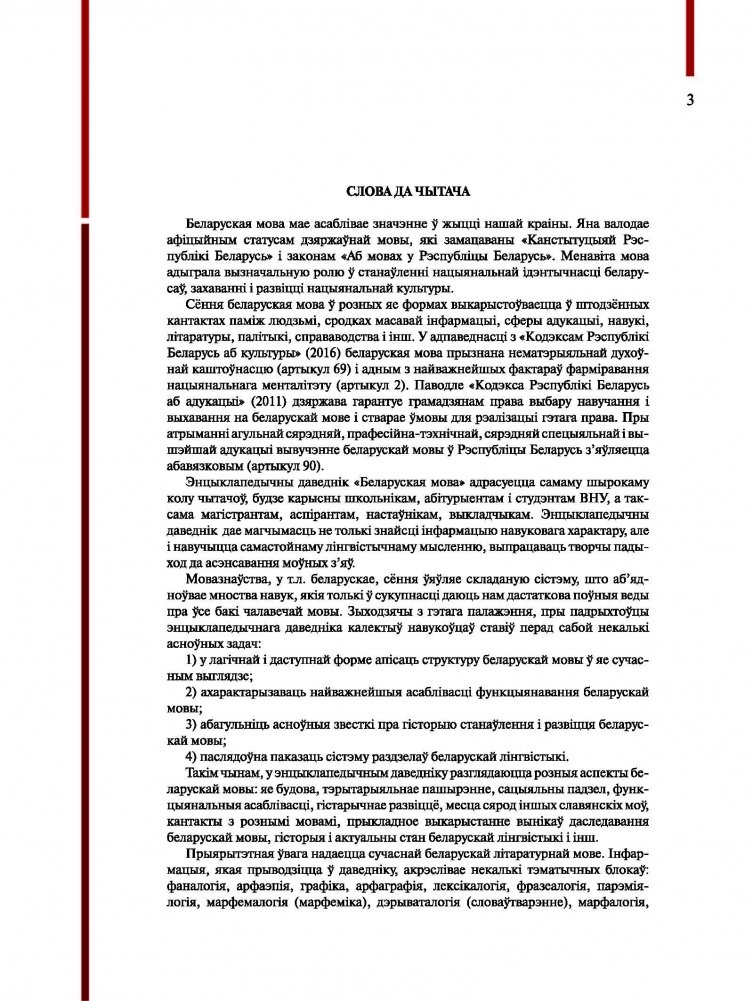 Энцыклапедычны даведнiк «Беларуская мова» ўключае больш за 290 артыкулаў, якiя прысвечаны беларускай мове, яе гiсторыi i сучаснаму стану, гукавому i лексiчнаму складу, фраземнаму фонду, графiцы i арфаграфii, марфалогii i сiнтаксiсу, дыялектнаму падзелу, слоўнiкам i iнш. Падрыхтаванае вядучымi беларускiмi мовазнаўцамi выданне будзе карысна ўсiм, каго цiкавiць вывучэнне беларускай мовы, удасканаленне сваiх ведаў, можа быць выкарыстана студэнтамi, вучнямi старэйшых класаў сярэднiх школ, гiмназiй, каледжаў i лiцэяў пры падрыхтоўцы да экзаменаў i паступлення ў вышэйшыя навучальныя ўстановы фiлалагiчнага профiлю.