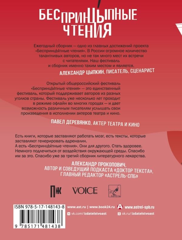 «БеспринцЫпные чтения» —литературно-театральный проект, в котором ведущие актеры театра и кино на разных площадках читают рассказы и повести популярных авторов. В этом сборнике собраны лучшие из лучших произведений за сезон.