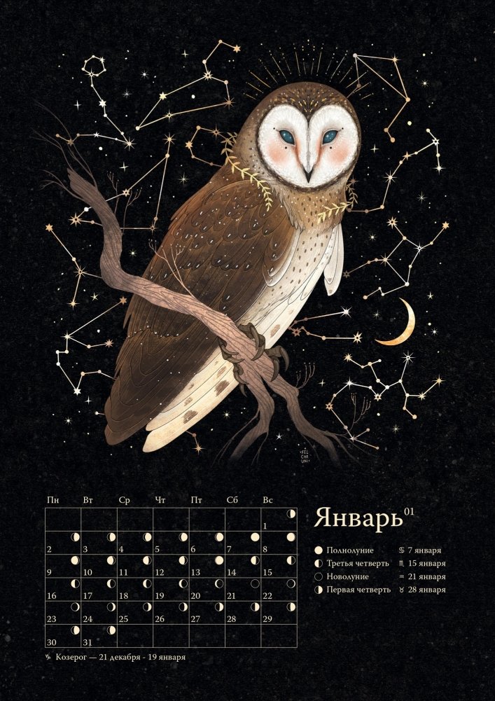 В календаре 12 иллюстраций, которые автор рисовала в течение года. Ботанические мотивы и волшебные существа, лес и дикая природа, луна и звезды. А также: