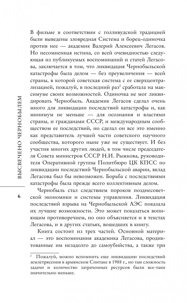 В основе этой книги лежат уникальные материалы: интервью, статьи и воспоминания академика Валерия Легасова, одного из руководителей ликвидации последствий Чернобыльской аварии, который первым в СССР и в мире в целом проанализировал последствия катастрофы и первым подробно рассказал о них. Помимо них, в книгу вошли статьи о технологическом и политическом аспектах катастрофы, написанные с использованием и современных материалов, и ранее не публиковавшихся архивных документов. Книга позволит читателю сформировать свое мнение о Чернобыльской катастрофе вопреки псевдонаучным теориям и политизированным популистским схемам.