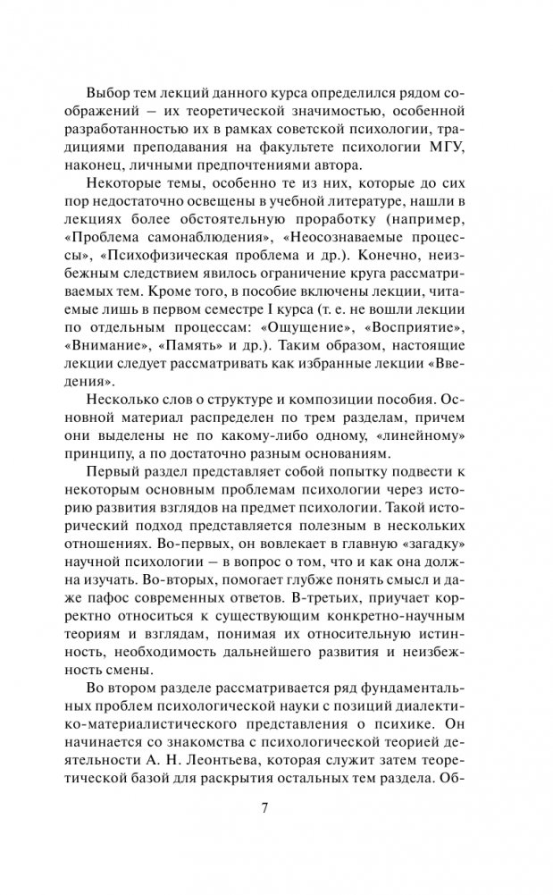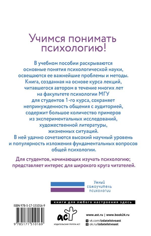 В учебном пособии раскрываются основные понятия психологической науки, освещаются ее важнейшие проблемы и методы. Книга, созданная на основе курса лекций, читавшегося автором в течение многих лет на факультете психологии МГУ для студентов 1-го курса, сохраняет непринужденность общения с аудиторией, содержит большое количество примеров из экспериментальных исследований, художественной литературы, жизненных ситуаций. В ней удачно сочетаются высокий научный уровень и популярность изложения фундаментальных вопросов общей психологии.
