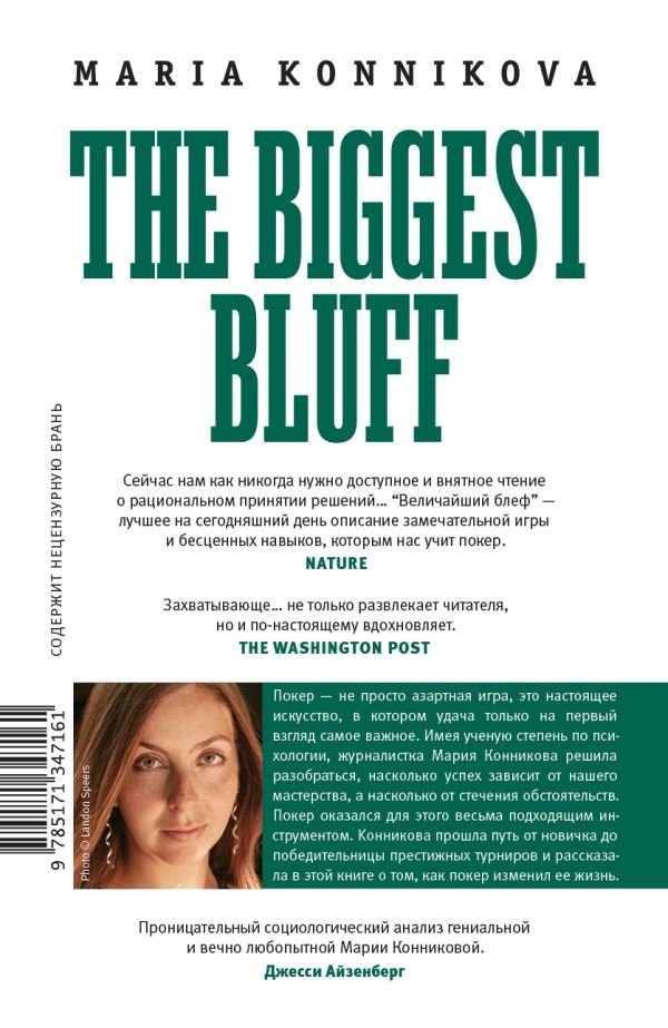 «Величайший блеф» — книга о том, как покер может изменить жизнь. В 2017 году русско‑американская писательница и доктор психологии Мария Конникова решает написать книгу о покере и начинает учиться с нуля. За два года она настолько овладевает мастерством игры, что становится чемпионом двух престижных турниров. В Колумбийском университете Конникова изучала механизмы принятия решений в трудных ситуациях и влияние факторов навыка и удачи на эти решения. Покер стал для нее идеальным полем для исследования, так как он сочетает в себе оба фактора. В игре важны не только подсчеты и логика, но и наблюдение за другими игроками: их жестами, словами и мимикой. Конникова рассказывает о приобретенных навыках не только в контексте игры, но и в жизни в целом. Мария Конникова пишет книгу «Величайший блеф» на протяжении всего своего обучения, а затем и участия в турнирах. В ней Конникова размышляет, насколько ее успех был обусловлен упорным трудом, а насколько простой удачей. Она дополняет свои размышления советами экспертов по покеру, а также научными теориями, включая теорию игр Джона фон Неймана, которой она вдохновлялась при написании книги.