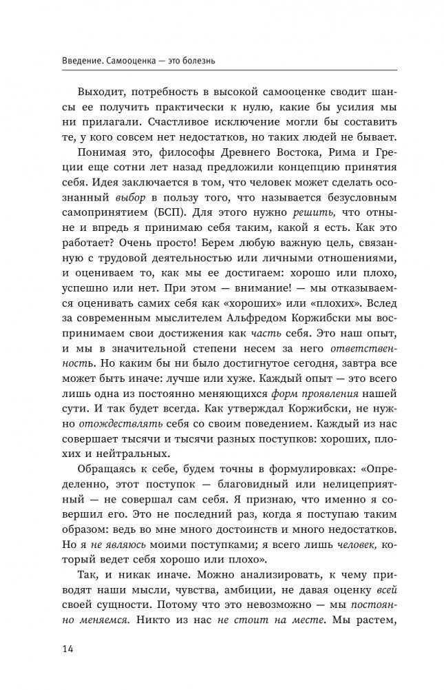 Легендарный психолог Альберт Эллис сравнивает самооценку с болезнью. Привычка постоянно оценивать себя может привести к тревожности, глубокой неудовлетворенности жизнью или даже депрессии. Вместо навязчивого оценивания и сравнения себя с окружающими он предлагает овладеть более здоровым и позитивным подходом: безусловным принятием.