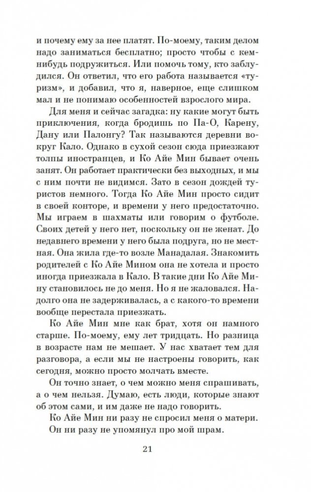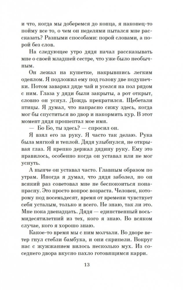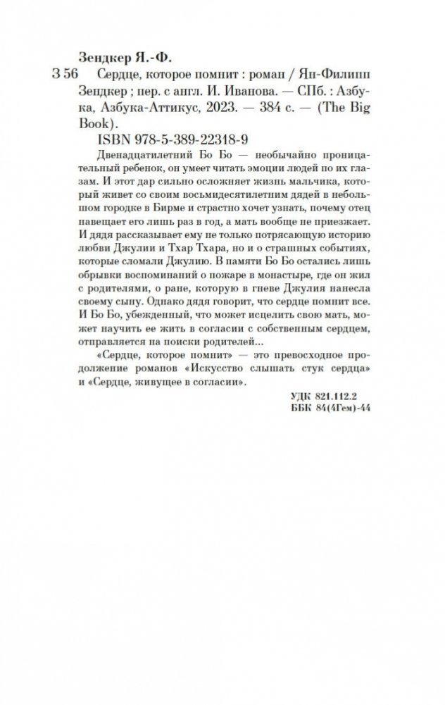 Двенадцатилетний Бо Бо — необычайно проницательный ребенок, он умеет читать эмоции людей по их глазам. И этот дар сильно осложняет жизнь мальчика, который живет со своим восьмидесятилетним дядей в небольшом городке в Бирме и страстно хочет узнать, почему отец навещает его лишь раз в год, а мать вообще не приезжает. И дядя рассказывает ему не только потрясающую историю любви Джулии и Тхар Тхара, но и о страшных событиях, которые сломали Джулию. В памяти Бо Бо остались лишь обрывки воспоминаний о пожаре в монастыре, где он жил с родителями, о ране, которую в гневе Джулия нанесла своему сыну. Однако дядя говорит, что сердце помнит все. И Бо Бо, убежденный, что может исцелить свою мать, может научить ее жить в согласии с собственным сердцем, отправляется на поиски родителей… «Сердце, которое помнит» — это превосходное продолжение романов «Искусство слышать стук сердца» и «Сердце, живущее в согласии».