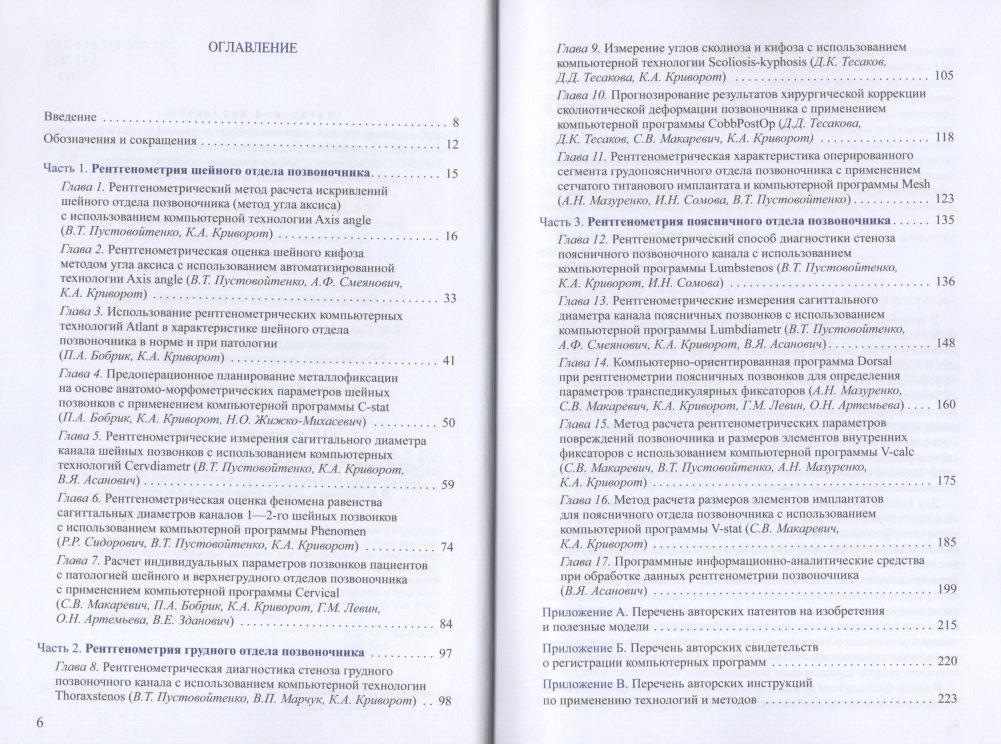 В книге описываются созданные и активно применяемые в Республиканском научно-практическом центре травматологии и ортопедии компьютерно-ориентированные методики рентгенометрии для диагностики повреждений и заболеваний позвоночника, планирования хирургического лечения и прогнозирования его результатов. Представленные программы смогут найти широкое применение в научных исследованиях и практическом здравоохранении травматологами-ортопедами, нейрохирургами, рентгенологами, хирургами-вертебрологами.