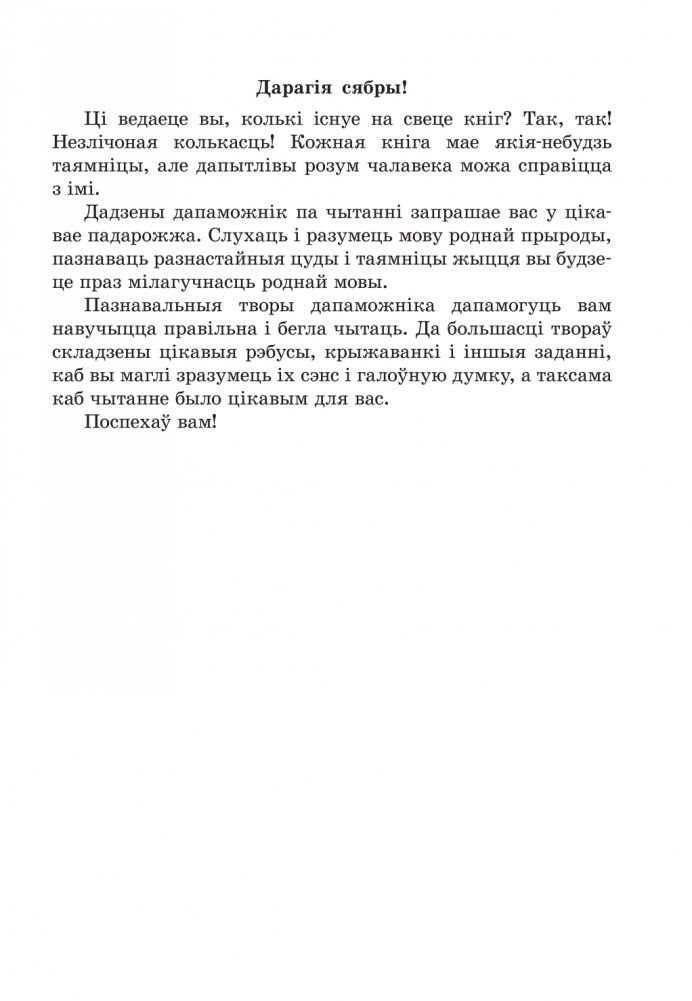У дапаможніку прадстаўлены творы для пазакласнага чытання для вучняў 2-га класа. Усе творы скампанаваны ў 9-ці раздзелах, згодна колькасці ўрокаў пазакласнага чытання адпаведна вучэбнай праграме, размешчаны такім чынам, каб чытанне на беларускай мове не выклікала цяжкасцей, было пазнавальным і захапляючым. Займальны і практычны матэрыял будзе садзейнічаць актывізацыі чытацкай дзейнасці вучняў.