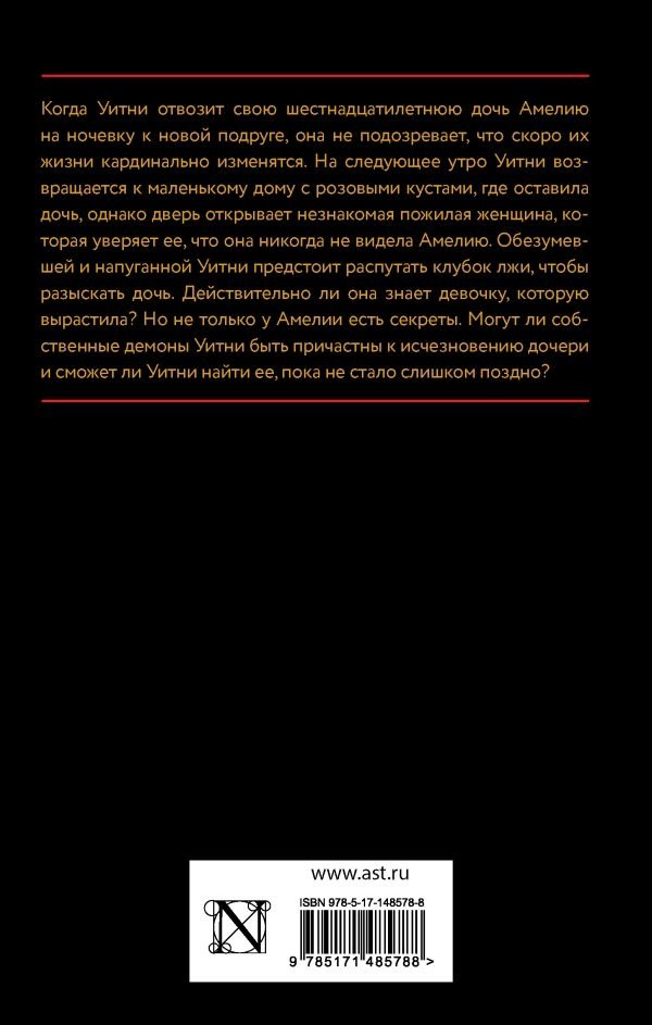 Когда Уитни отвозит свою шестнадцатилетнюю дочь Амелию на ночевку к новой подруге, она не подозревает, что скоро их жизни кардинально изменятся. На следующее утро Уитни возвращается к маленькому дому с розовыми кустами, где оставила дочь, однако дверь открывает незнакомая пожилая женщина, которая уверяет ее, что она никогда не видела Амелию. Обезумевшей и напуганной Уитни предстоит распутать клубок лжи, чтобы разыскать дочь. Действительно ли она знает девочку, которую вырастила? Но не только у Амелии есть секреты. Могут ли собственные демоны Уитни быть причастны к исчезновению дочери и сможет ли Уитни найти ее, пока не стало слишком поздно?