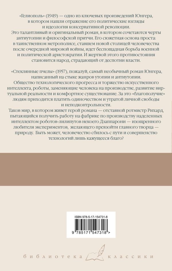 "Гелиополь" (1949) — одно из ключевых произведений Юнгера, в котором нашли отражение его политические взгляды и идеология консервативной революции. Это талантливый и оригинальный роман, в котором сочетаются черты антиутопии и философской притчи. Его сюжетная основа проста: в таинственном метрополисе, ставшем новой столицей человечества после очередной мировой войны, идет беспощадная борьба военной и политической аристократии. И жертвой этого противостояния становится народ, страдающий от деспотии власти. "Стеклянные пчелы" (1957) — пожалуй, самый необычный роман Юнгера, написанным на стыке жанров утопии и антиутопии. Общество технологического прогресса и торжество искусственного интеллекта, роботы, заменяющие человека на производстве, развитие виртуальной реальности и комфортное существование. За это "благополучие" людям приходится платить одиночеством, и утратой личной свободы и неподконтрольности. Таков мир, в котором живет герой романа — отставной ротмистр Рихард, пытающийся получить работу на фабрике по производству наделенных интеллектом роботов-лилипутов некоего Дзаппарони — изощренного любителя экспериментов, желающего превзойти главного творца — природу. Быть может, человечество сбилось с пути и совершенство технологий лишь кажущееся благо?