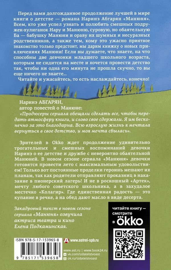 Перед вами долгожданное продолжение лучшей в мире книги о детстве — романа Наринэ Абгарян «Манюня». Всем, кто уже успел узнать и полюбить смешных подружек-хулиганок Нару и Манюню, суровую, но обаятельную Ба — бабушку Манюни — и ораву их шумных и несуразных родственников, а также тем, кому это ужасно приятное знакомство только предстоит, мы дарим книжку о новых приключениях Манюни! Если вы думаете, что знаете, на что способны две девчонки младшего школьного возраста, которым не сидится на месте и хочется провести детство так, чтобы ни одна его минута не прошла скучно, то вы еще ничего не знаете... Читайте и ужасайтесь, то есть наслаждайтесь, конечно!