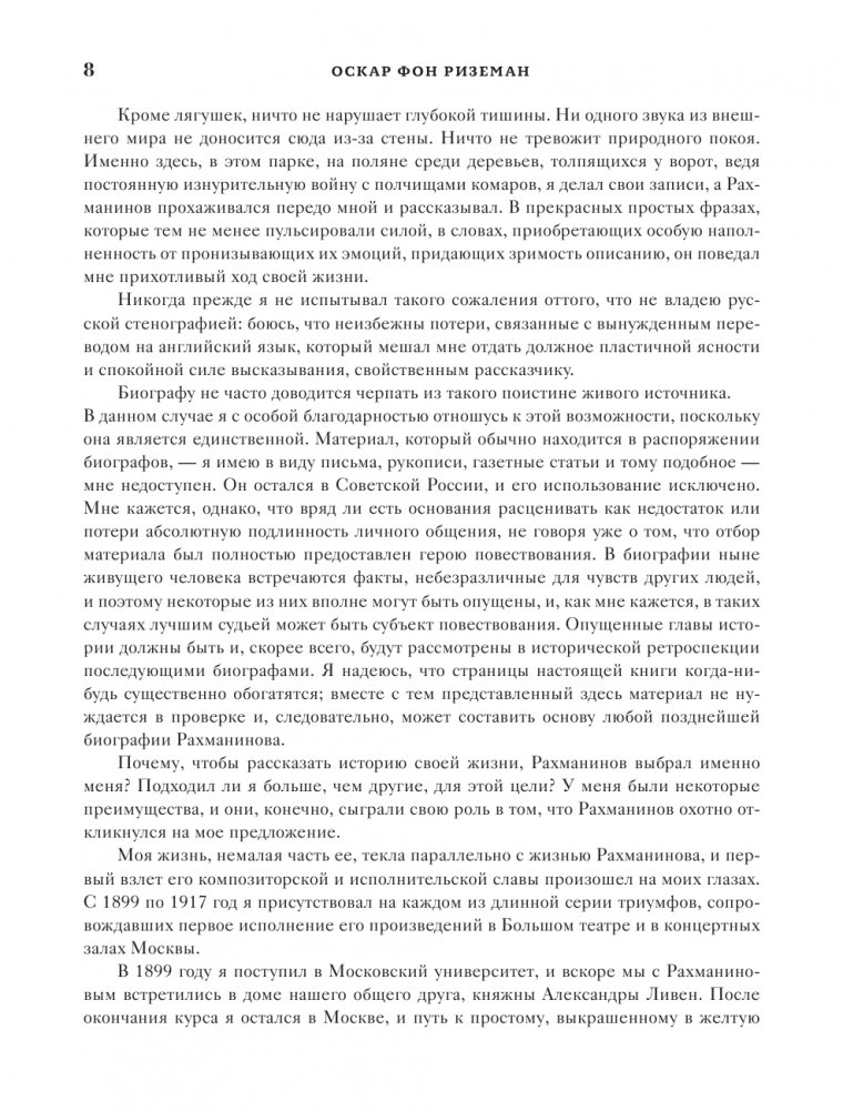Сергей Васильевич Рахманинов, к сожалению, не оставил мемуаров, и перед нами фактически единственный подлинный мемуарный документ — рассказ композитора о себе. Книга воспоминаний Рахманинова, записанных Оскаром фон Риземаном, была издана в Лондоне в 1934 году. Со страниц книги звучит голос нашего великого соотечественника, рассказывающего о своем детстве, годах учения, первых шагах в качестве пианиста, дирижера, о драматических событиях и триумфах, сделавших его уже к тридцати годам гордостью и славой России. Выход альбома приурочен к 150-летию со дня рождения великого композитора.