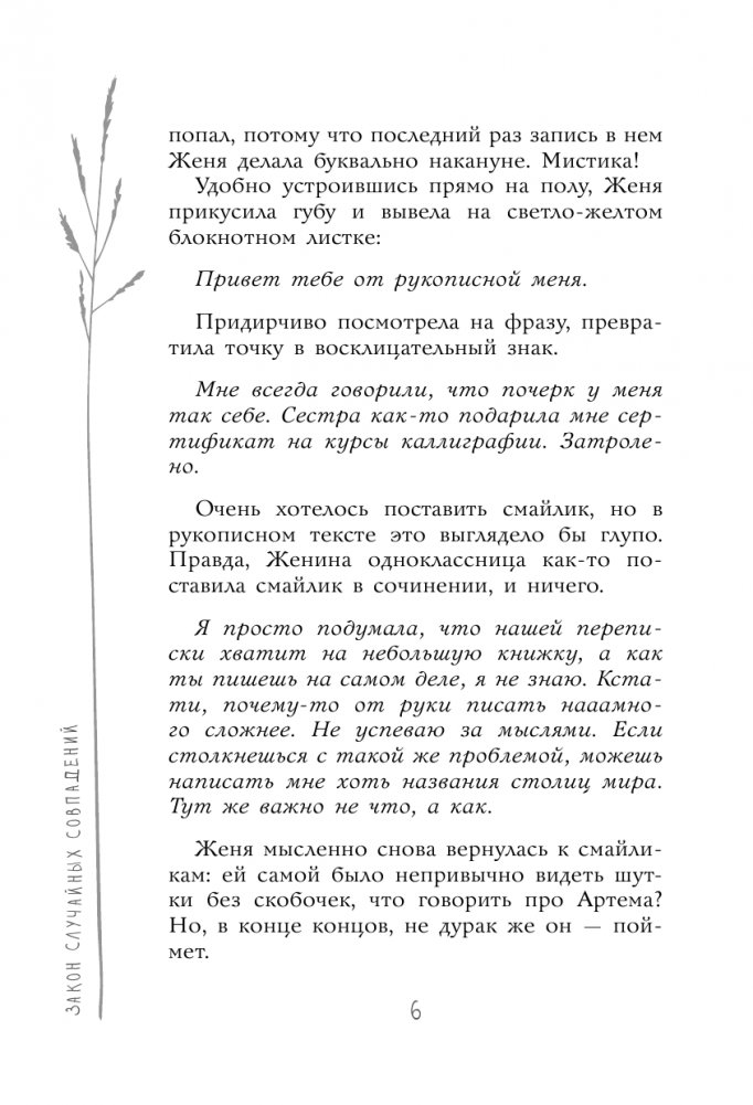 «Закон случайных совпадений» — новая книга современной писательницы Ксени Роу. В этой повести для подростков пять историй, на первый взгляд не связанных между собой. Однако постепенно внимательный читатель находит отголоски одной истории в другой: например, Женькина смешная шапочка с кошачьими ушами вдруг мелькнет на площади, по которой гуляют Мельников и Алиса — герои совсем другого рассказа, или вдруг из небытия возникнет старый знакомый, который здесь и сейчас оказывается очень к месту. Но ведь на то он и закон случайных совпадений, не так ли? Для среднего школьного возраста.