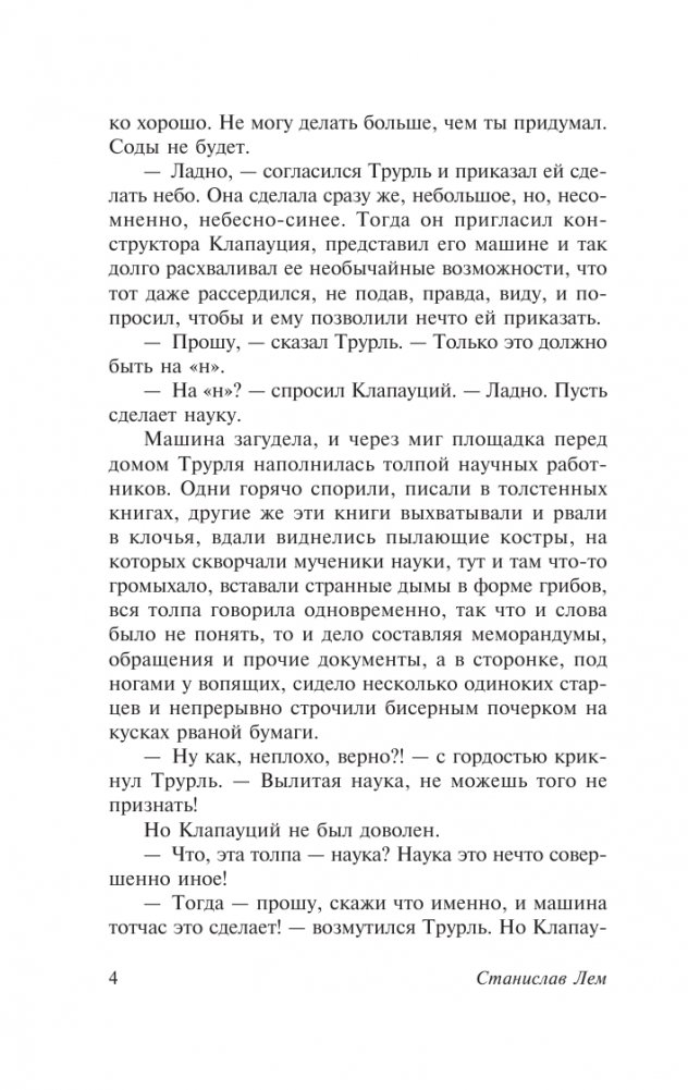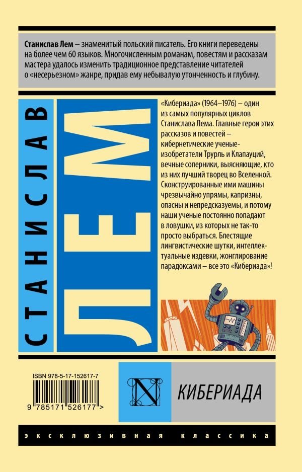"Кибериада" (1964 – 1976) – один из самых популярных циклов Станислава Лема. Главные герои этих рассказов и повестей – кибернетические ученые-изобретатели Трурль и Клапауций, вечные соперники, выясняющие, кто из них лучший творец во Вселенной. Сконструированные ими машины чрезвычайно упрямы, капризны, опасны и непредсказуемы, и потому наши ученые постоянно попадают в ловушки, из которых не так-то просто выбраться. Блестящие лингвистические шутки, интеллектуальные издевки, жонглирование парадоксами – все это "Кибериада"!