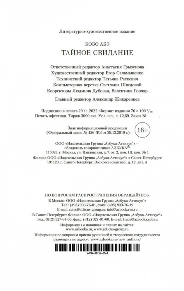 Кобо Абэ — блистательная звезда послевоенного японского авангарда; его книги читают по всему миру, по ним снимают фильмы и ставят спектакли. Продолжатель традиций Достоевского, Эдгара Аллана По, Франца Кафки и Альберто Моравиа, предтеча Харуки Мураками, в каждом своем романе он творит сюрреалистическую реальность, которая переформатирует читательскую картину мира, искажает — или проясняет — призмы восприятия и всякий раз совершенно ошеломляет. Недаром еще один известный японский автор Кэндзабуро Оэ назвал Абэ крупнейшим писателем за всю историю литературы... В «Тайном свидании» жену главного героя увозят в больницу неизвестно откуда взявшиеся санитары, хотя она совершенно здорова. Пытаясь ее вернуть, ошеломленный герой погружается в больничный ад — кафкианское государство в государстве, сюрреалистический мир в себе, где единственный способ выжить — стать частью системы и играть по правилам, закрывая глаза на повсеместный и всем остальным привычный абсурд.