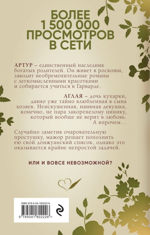 Артур – единственный наследник богатых родителей. Он живет в роскоши, заводит необременительные романы с легкомысленными красотками и собирается учиться в Гарварде. Аглая – дочь кухарки, давно уже тайно влюбленная в сына хозяев. Неискушенная наивная девушка, конечно, не пара закореннелому цинику, который вообще не верит в любовь. А впрочем… Случайно заметив очаровательную простушку, мажор решает пополнить ею свою донжуанский список, однако это оказывается крайне непростой задачей. Или и вовсе невозможной?