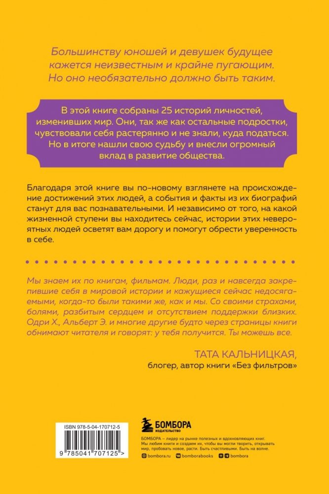 В этой книге собраны 25 историй личностей, изменивших мир. Они, так же как остальные подростки, чувствовали себя растерянно и не знали, куда податься. Но в итоге нашли свою судьбу и внесли огромный вклад в развитие общества.