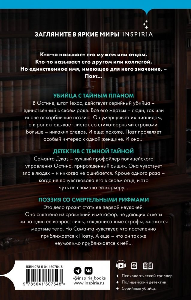 Это дело грозит стать ее первой неудачей. Оно сплетено из сравнений и метафор, не дающих ответы ни на один ее вопрос; лишь, как дописанные строфы, множатся мертвые тела. Но Саманта чувствует, что постепенно приближается к Поэту. А еще – что он так же неумолимо приближается к ней…