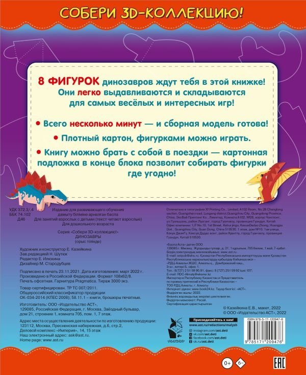 В этой книге малыша ждут 8 различных фигурок динозавров для сборки! Для сборки фигурок не нужны никакие дополнительные материалы — все детали прорезаны по контуру, легко выдавливаются и складываются. Этот конструктор развивает мелкую моторику, усидчивость и внимательность, а понятные инструкции и легкость сборки превратят любое занятие в развлечение!