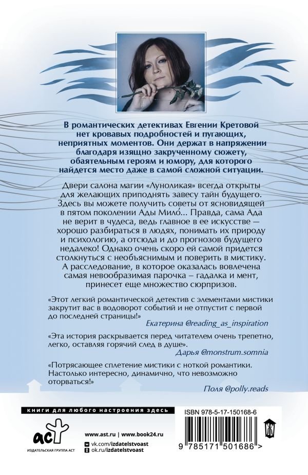 Двери салона магии "Луноликая" всегда открыты для желающих приподнять завесу тайн будущего. Здесь вы можете получить советы от ясновидящей в пятом поколении Ады Мило́... Правда, сама Ада не верит в чудеса, ведь главное в ее искусстве — хорошо разбираться в людях, понимать их природу и психологию, а отсюда и до прогнозов будущего недалеко! Однако очень скоро ей самой придется столкнуться с необъяснимым и поверить в мистику.