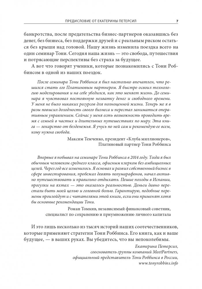 Тони Роббинс, взявший интервью у пятидесяти величайших финансовых умов мира и написавший книгу «Деньги. Мастер игры», которая стала бестселлером №1 по рейтингу New York Times, вновь возвращается к читателю с пошаговым сценарием перемен в вашей финансовой жизни. Он поведет вас по пути к финансовой свободе. Неважно, сколько вы зарабатываете, каков ваш возраст и давно ли вы начали свой трудовой путь. Эта книга даст вам инструменты, которые помогут достичь ваших финансовых целей быстрее, чем вы могли себе представить.