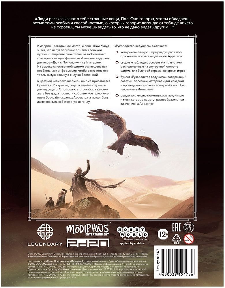 "Руководство ведущего" – это набор из небольшой брошюры с советами для ведущего, которые помогут написать захватывающую историю и создать идеальное приключение в песчаных просторах Арракиса, и ширмы, на лицевой стороне которой изображена красочная карта планеты, а на тыльной – кратко изложенные основные правила игры, фазы хода и особенности создания неигровых персонажей. В общем, необходимый аксессуар для проведения игры.