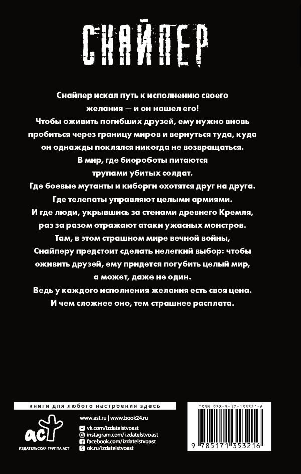 Чтобы оживить погибших друзей, Снайпер вновь должен пробиться сквозь границу миров и вернуться туда, куда он клялся никогда не возвращаться. В мир, где телепаты управляют целыми армиями, боевые мутанты и киборги охотятся друг на друга, а биороботы питаются трупами убитых солдат. Мир, где укрывшиеся за стенами древнего Кремля люди раз за разом отражают атаки ужасных монстров. Вернувшись в края вечной войны, Снайпер оказывается перед нелегким выбором: готов ли он ради воскрешения своих друзей погубить целый мир. А возможно даже и не один.