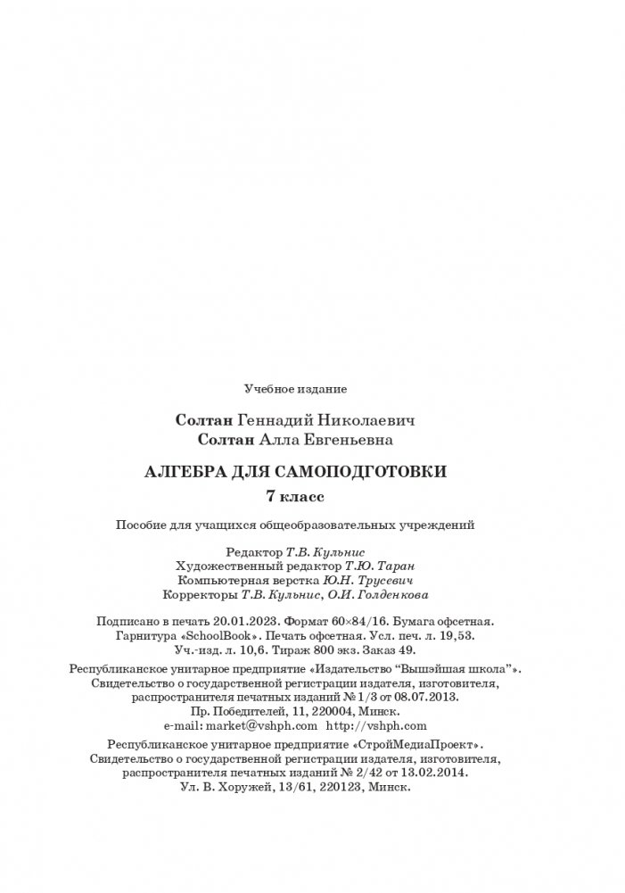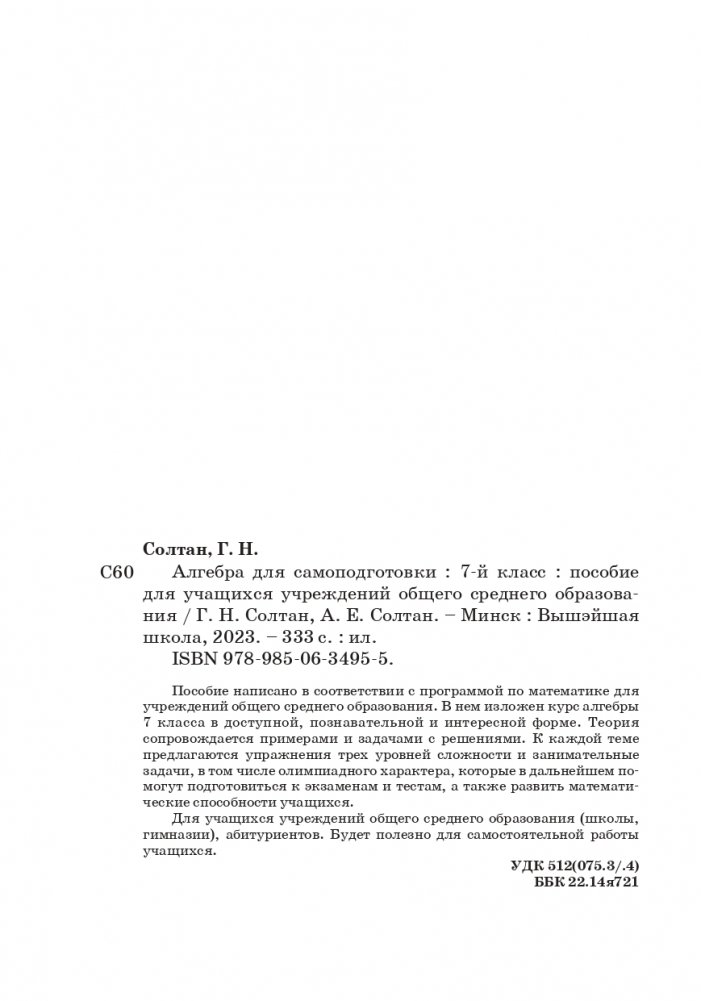 Пособие написано в соответствии с программой по математике для учреждений общего среднего образования. В нем изложен курс алгебры 7 класса в доступной, познавательной и интересной форме. Теория сопровождается примерами и задачами с решениями. К каждой теме предлагаются упражнения трех уровней сложности и занимательные задачи, в том числе олимпиадного характера, которые в дальнейшем помогут подготовиться к экзаменам и тестам, а также развить математические способности учащихся.