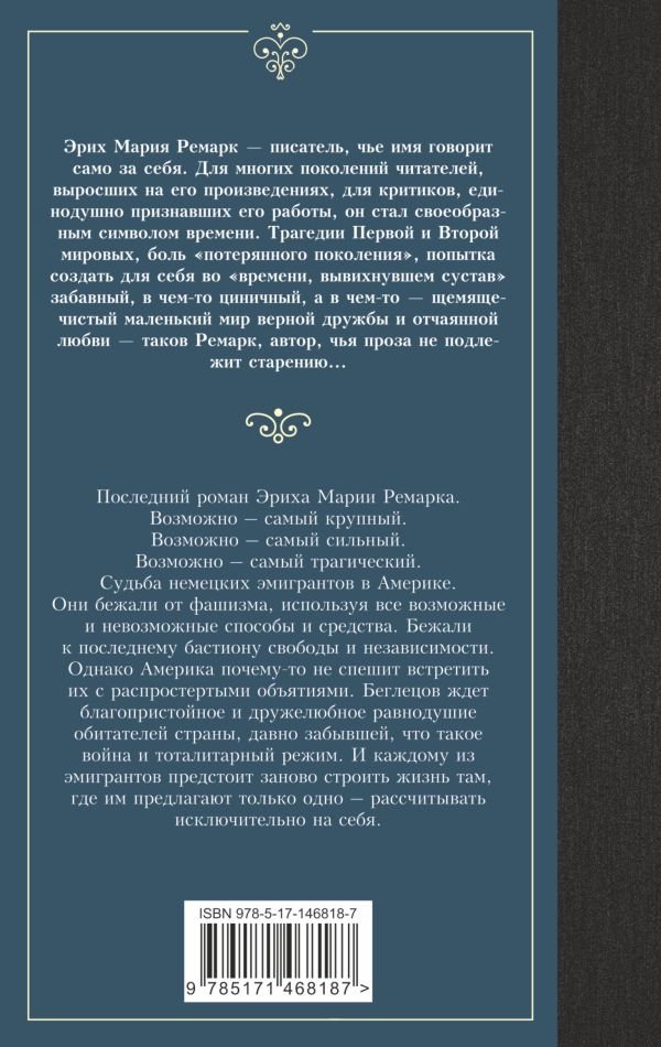 Последний роман Эриха Марии Ремарка. Возможно – самый крупный. Возможно – самый сильный. Возможно – самый трагический.