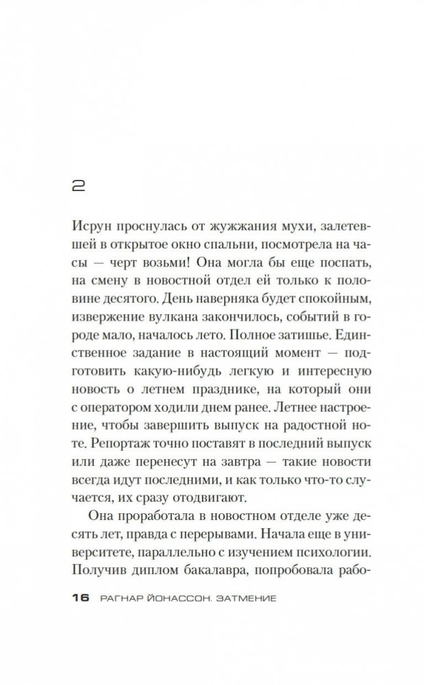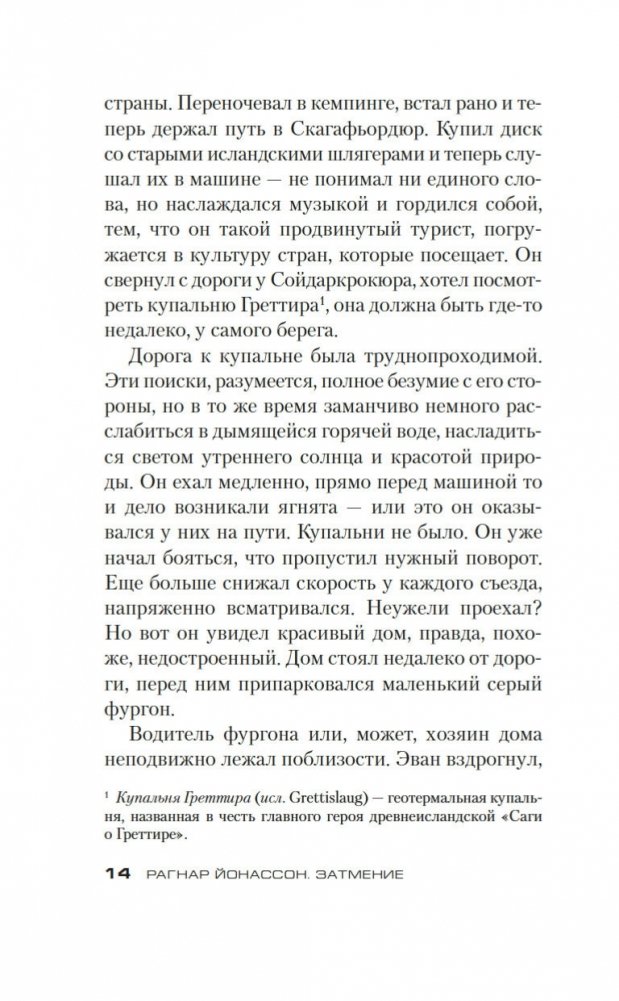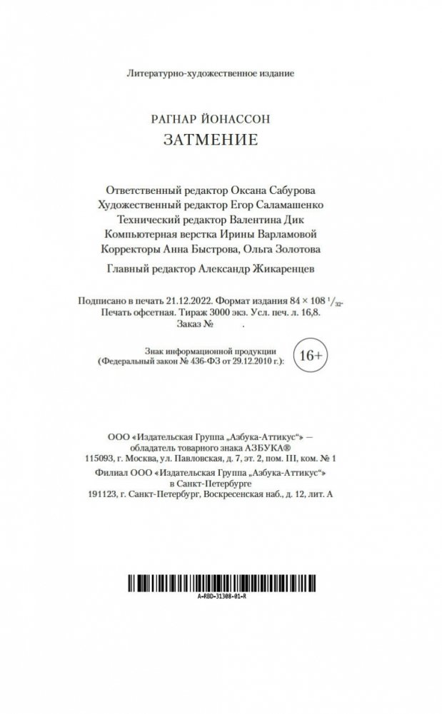 В глухом месте на севере Исландии обнаружено изуродованное тело. Офицер полиции Ари Тор, которому поручено расследование, пытается собрать всю информацию о жертве преступления, чтобы понять причины трагедии. Однако личность убитого интересует не только полицейского. Параллельное расследование ведет также журналистка из Рейкьявика, и движет ею не только желание написать сенсационный репортаж. В то же время в заброшенной деревеньке недалеко от места преступления томится взаперти, ожидая смерти, непальская девушка… Загадок становится все больше, прошлое играет с настоящим, напряжение нарастает, а сюжетные линии сплетаются в тугой клубок. «Затмение» — вторая книга в серии об Ари Торе, молодом детективе, который, оставив в Рейкьявике дом и возлюбленную, прибыл на службу в полиции в небольшой городок на севере страны, отрезанный от остального мира суровой природой. Книга вышла сразу вслед за «Снежной слепотой» и имела большой успех у читателей, как и другие книги Рагнара Йонассона, «короля скандинавского нуара», удостоенного престижных литературных наград и признанного одним из лучших современных писателей, работающих в жанре детектива. Впервые на русском языке!